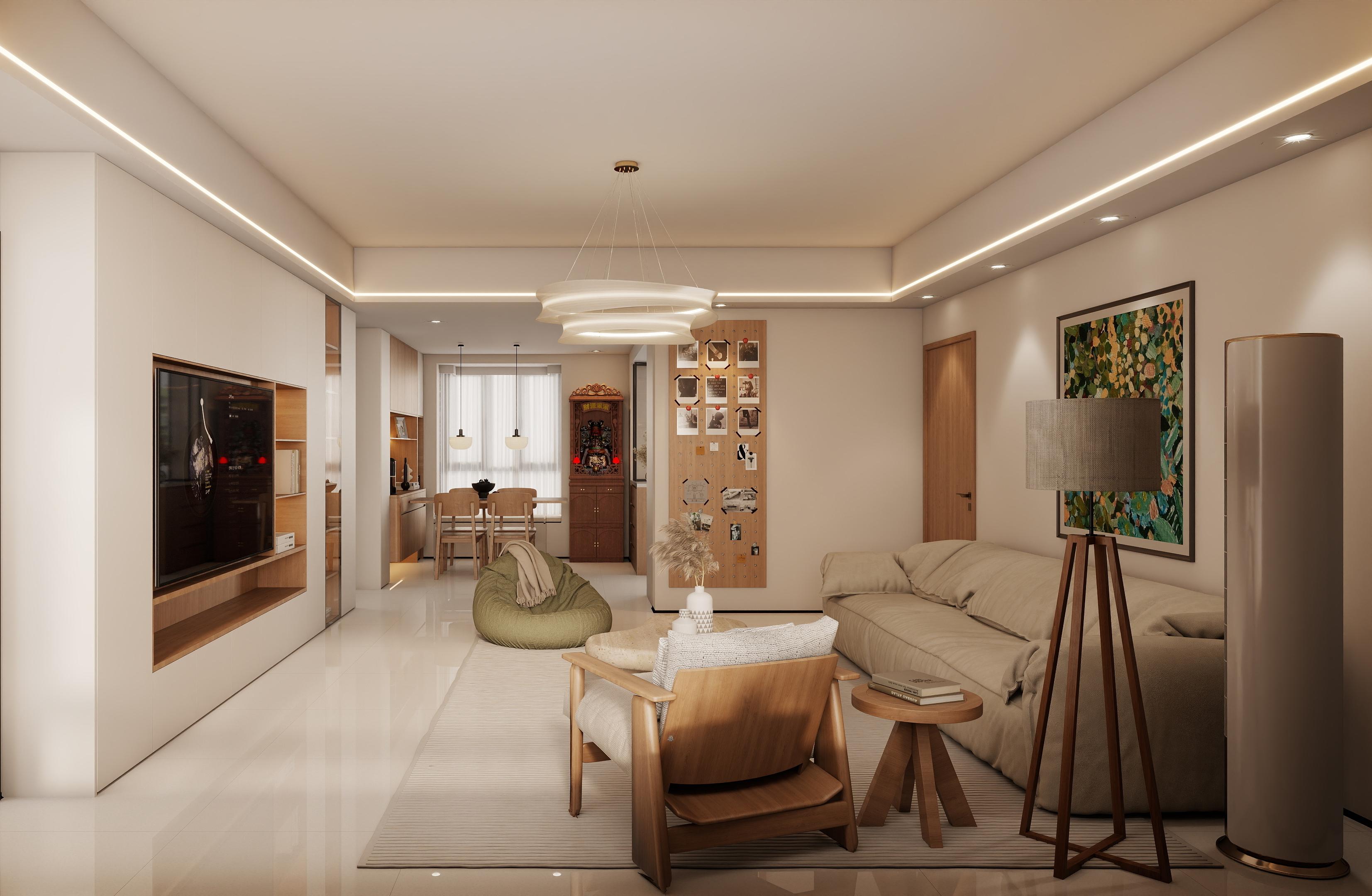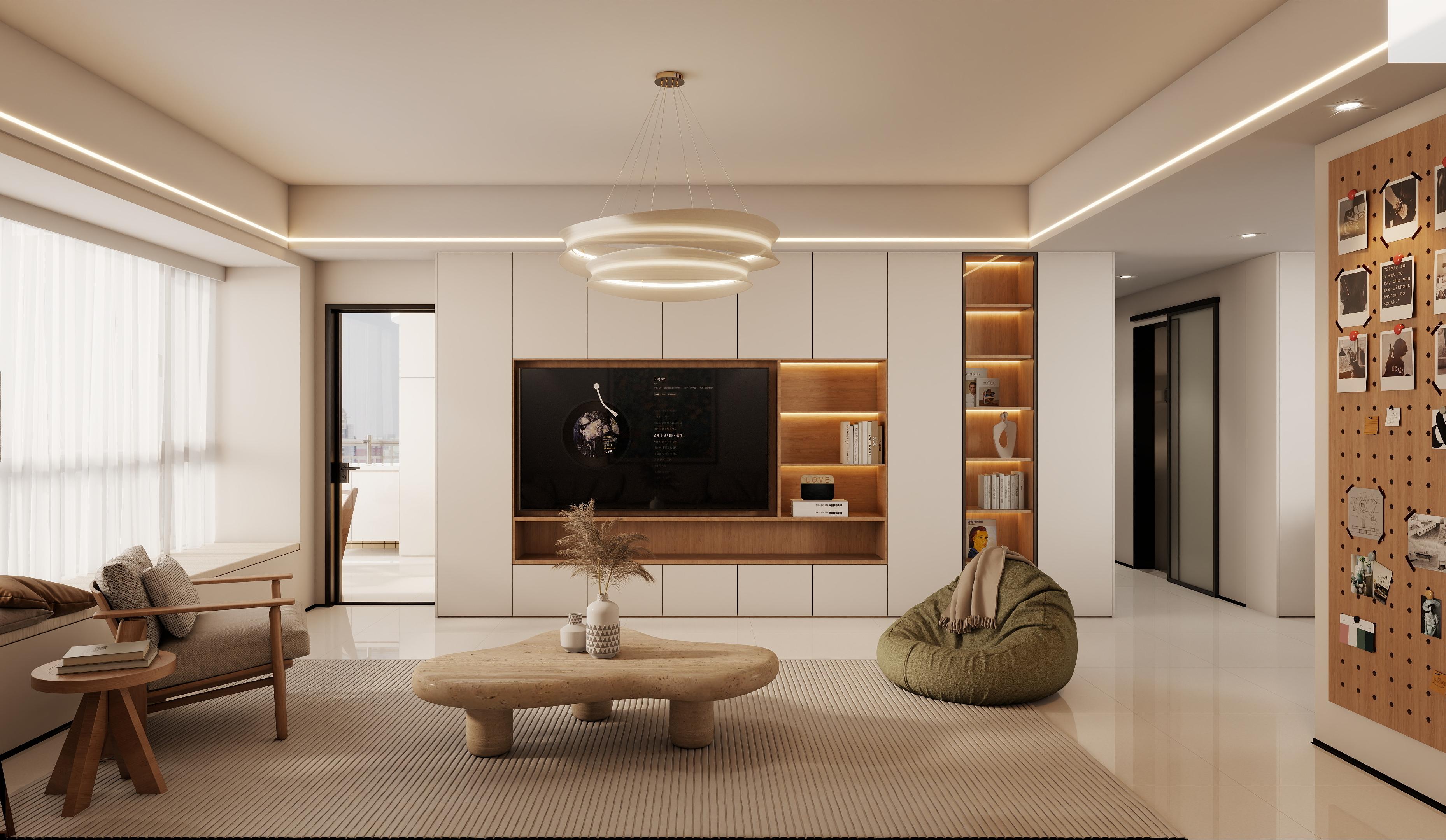 整體采用淺色系墻面與地板,搭配木質(zhì)元素電視墻,營造出明亮、溫馨的現(xiàn)代簡(jiǎn)約風(fēng)格。嵌入式燈帶與環(huán)形吊燈結(jié)合,提升空間層次感與通透感。電視墻設(shè)計(jì)為組合柜白色柜體+木色開放格,兼顧儲(chǔ)物與展示需求。不規(guī)則石紋茶幾、豆袋椅與木質(zhì)邊幾的搭配,既滿足日常休閑需求,又增添空間靈活性。