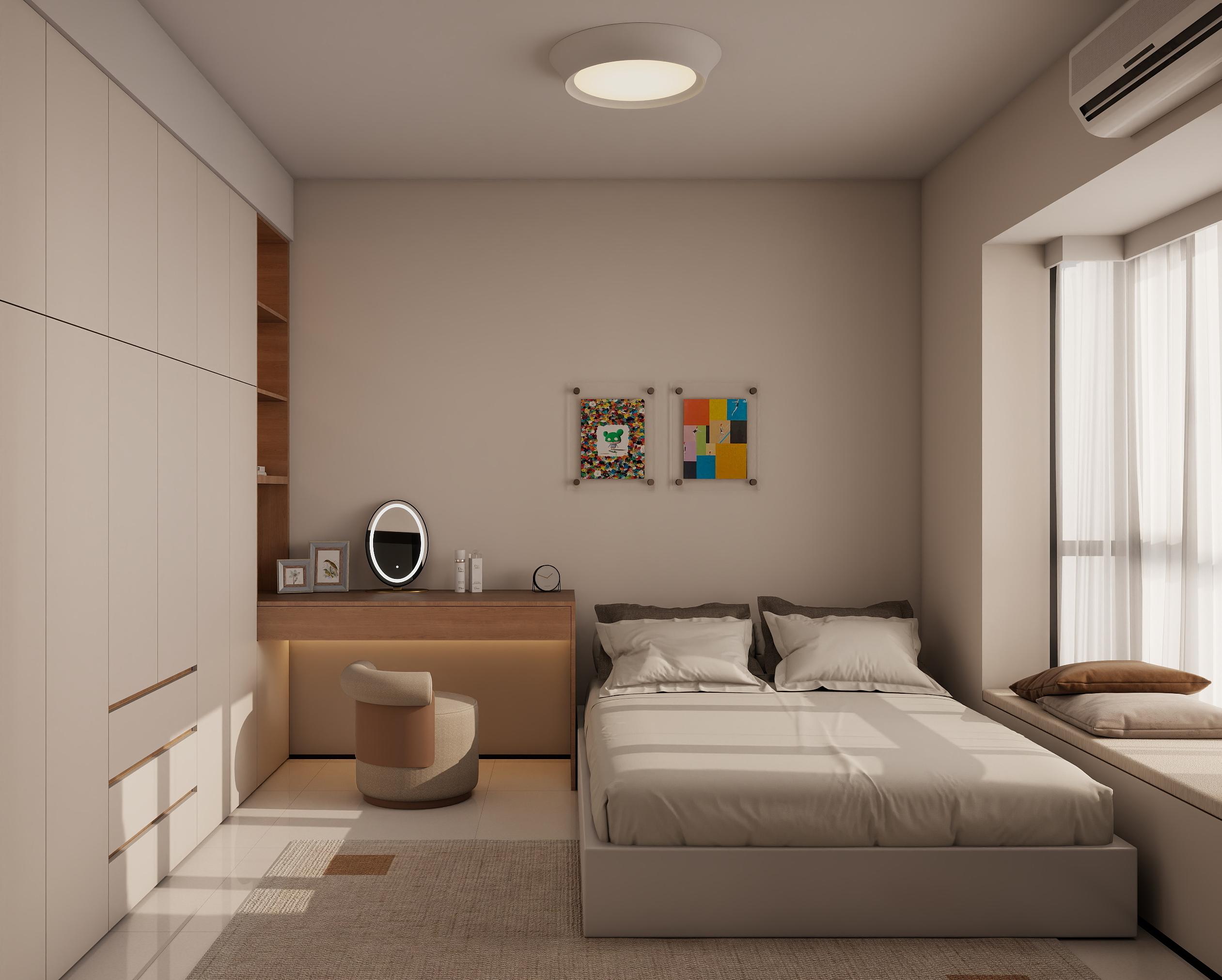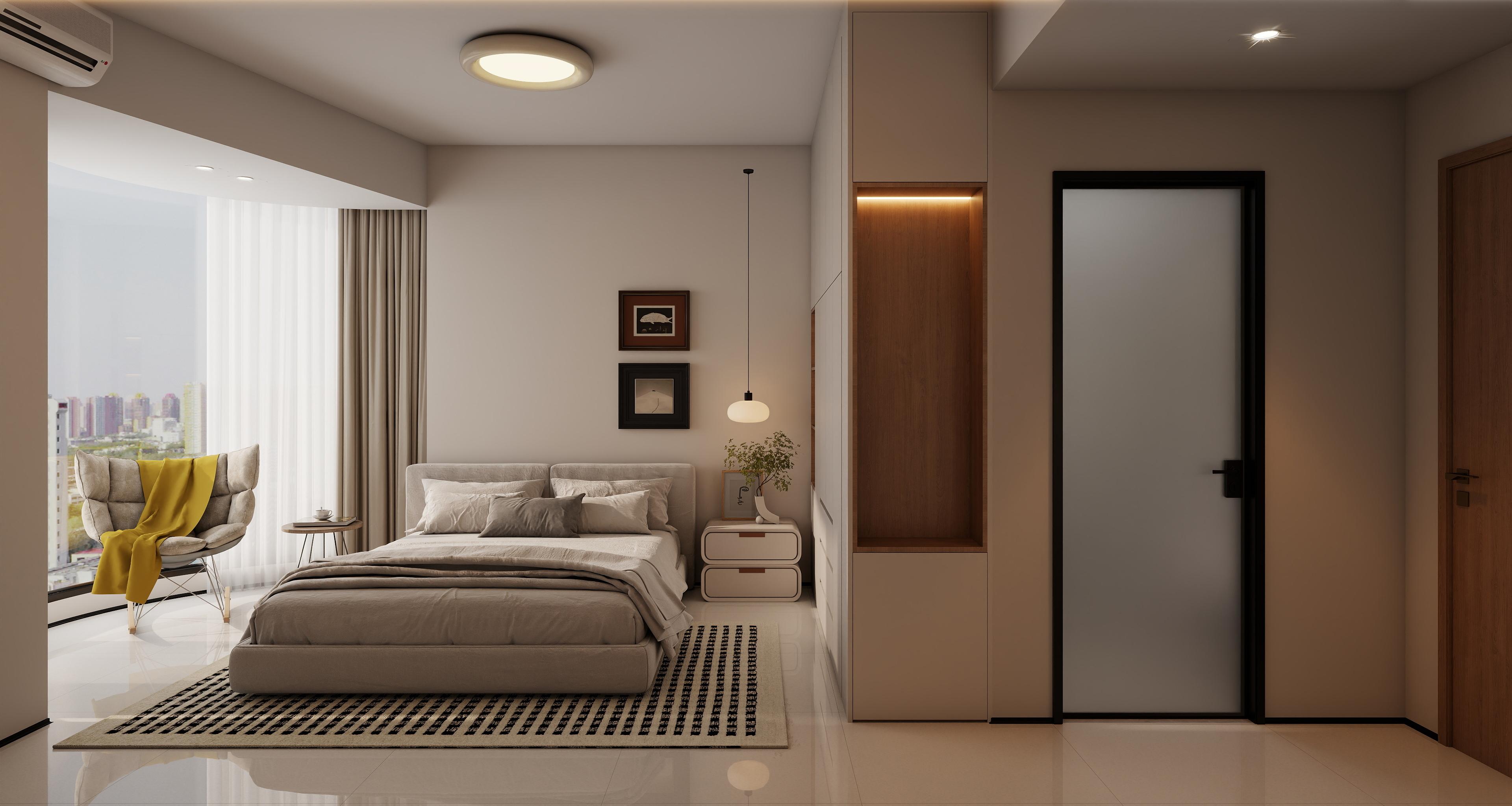 主臥以中性灰、米白色為主,搭配黑白格地毯與木質(zhì)家具,呈現(xiàn)寧靜舒適的氛圍。床頭裝飾畫與吊燈點(diǎn)綴空間藝術(shù)感,飄窗引入自然光,增強(qiáng)通透性。