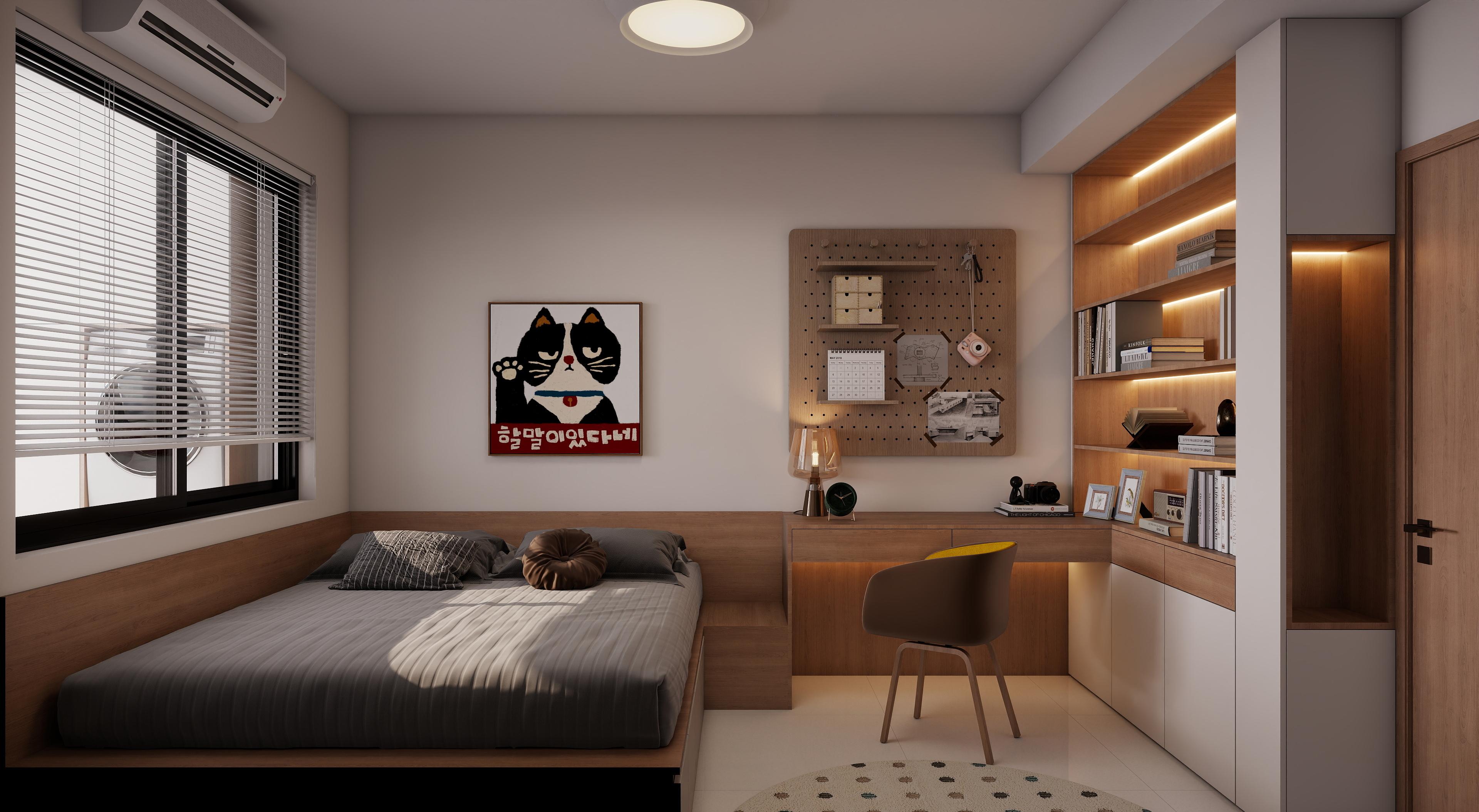 次臥定制榻榻米床節(jié)省空間,集成書桌與書架,實(shí)現(xiàn)“睡眠+學(xué)習(xí)+儲(chǔ)物”多功能一體化。木色與白色搭配,輔以彩色裝飾畫,平衡實(shí)用性與活潑感。