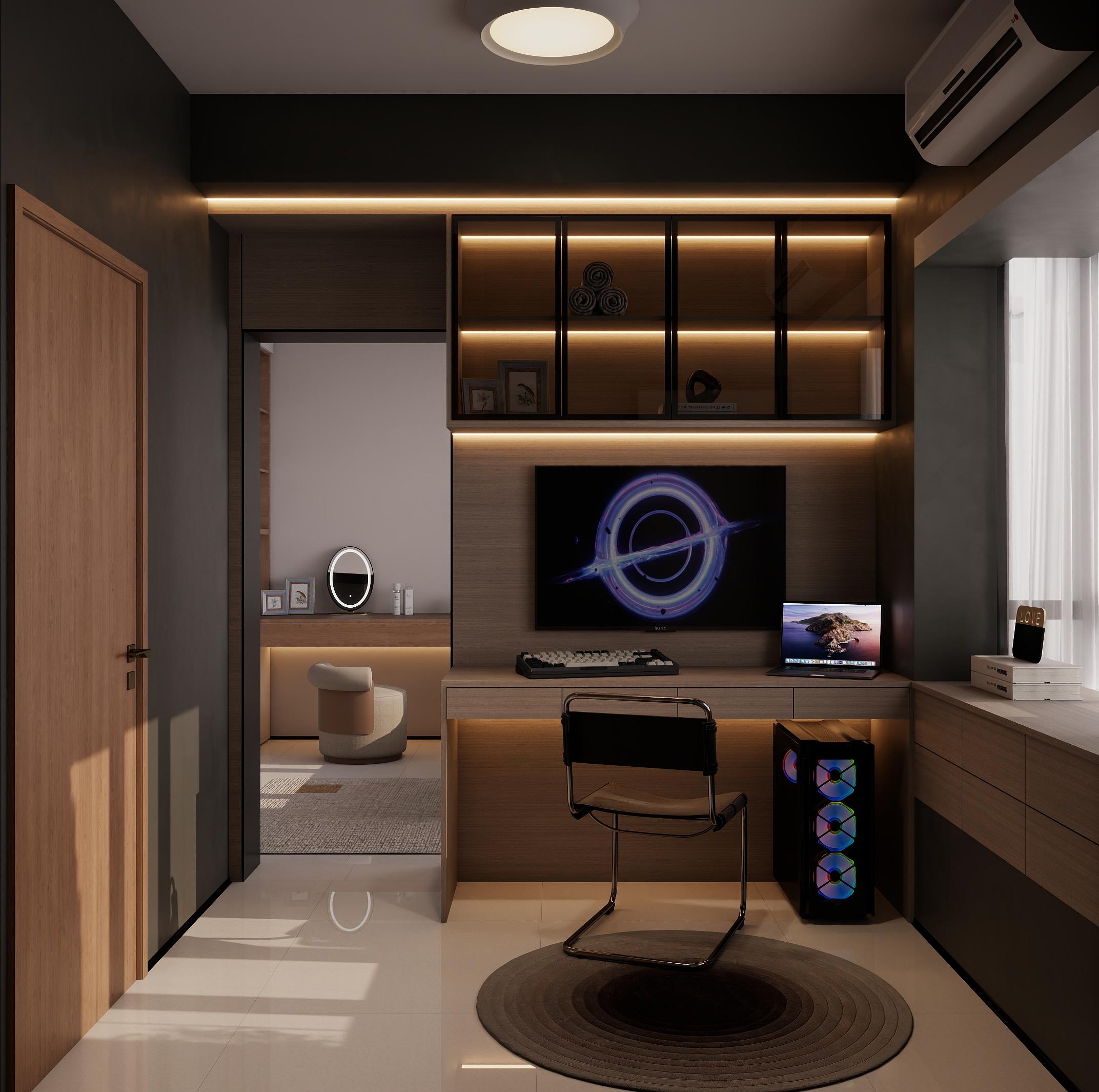 深色背景墻搭配暖光燈帶,營造專注或娛樂氛圍;電腦、書架與鏡柜的組合滿足工作、游戲與收納需求。