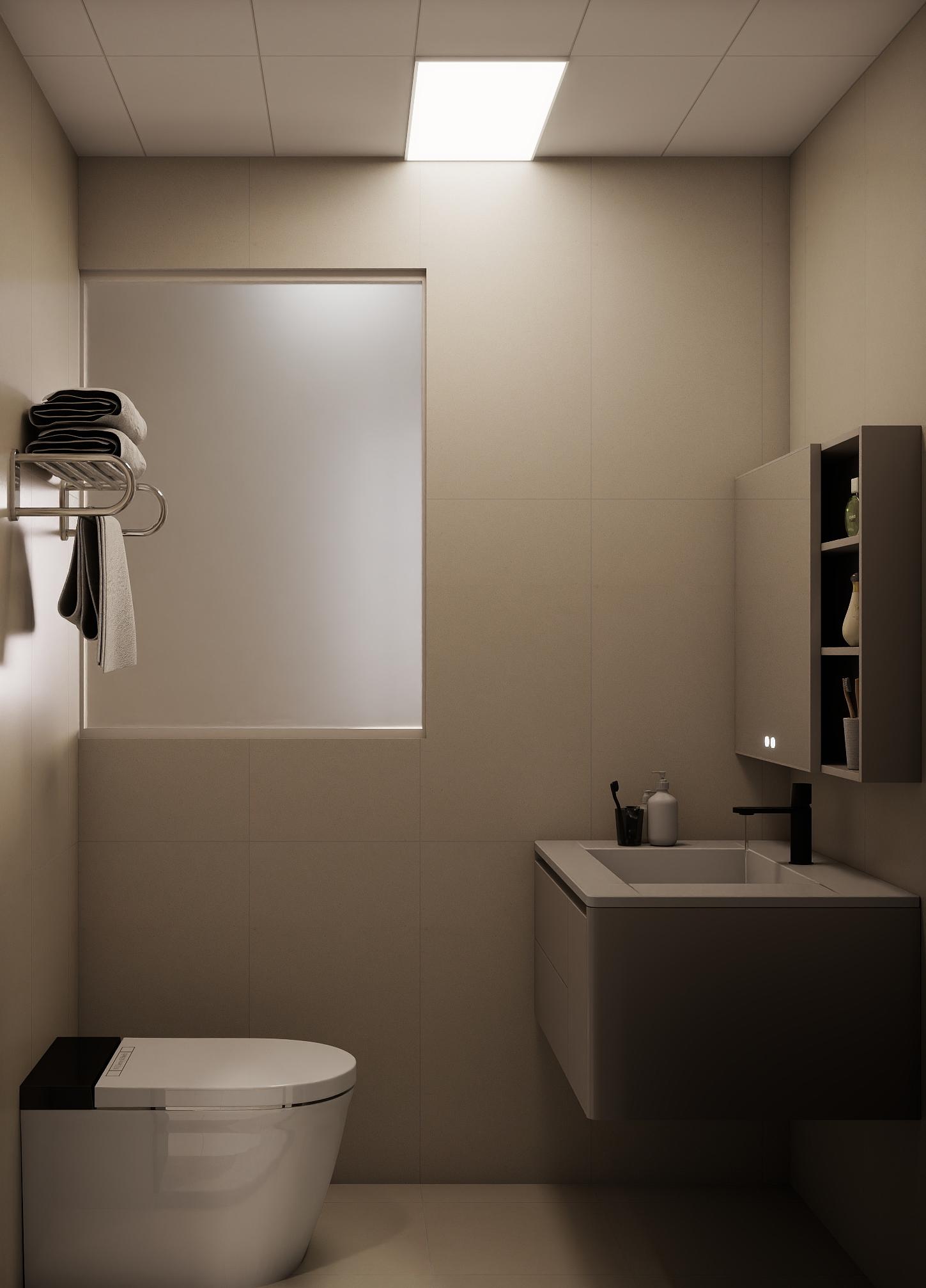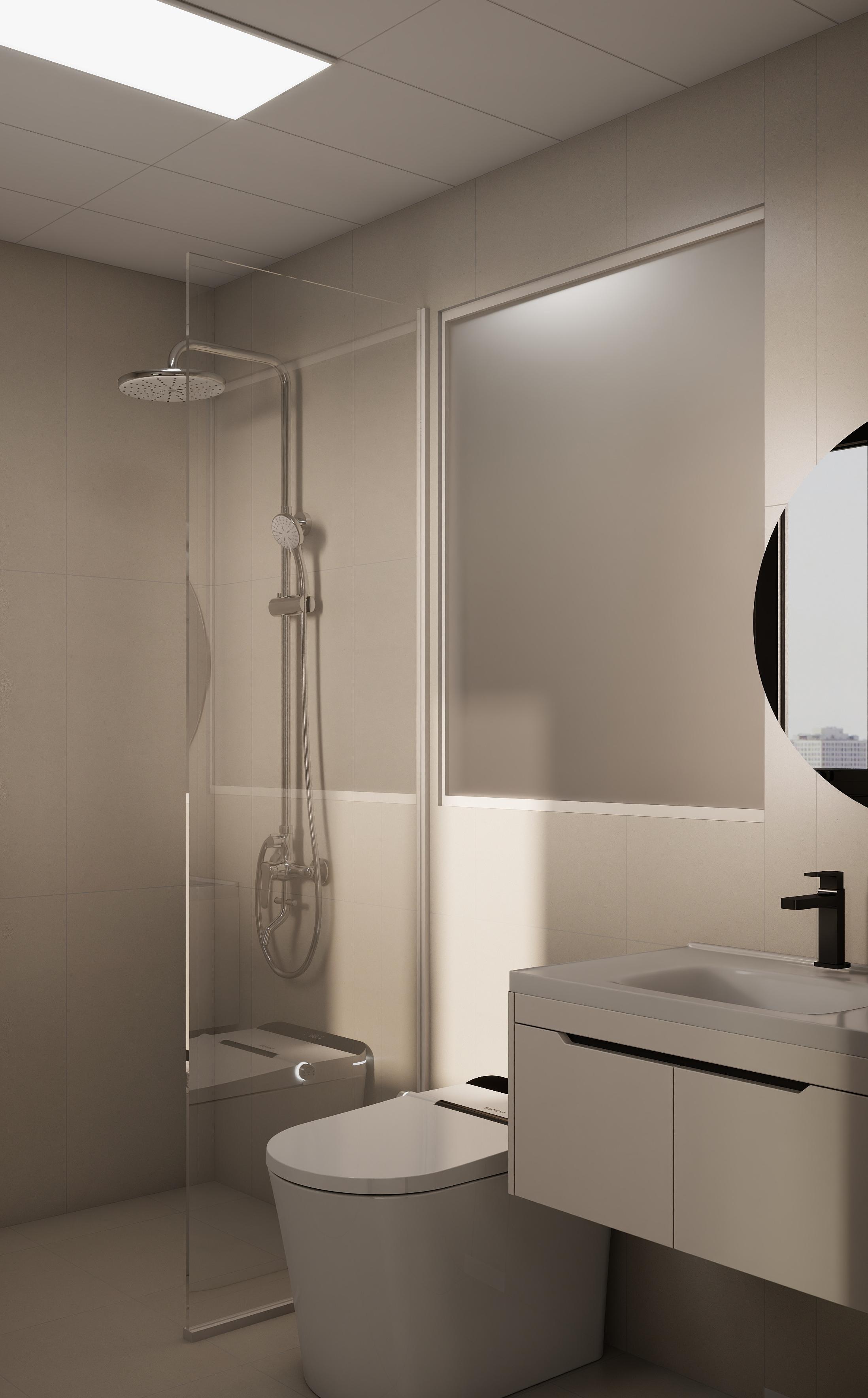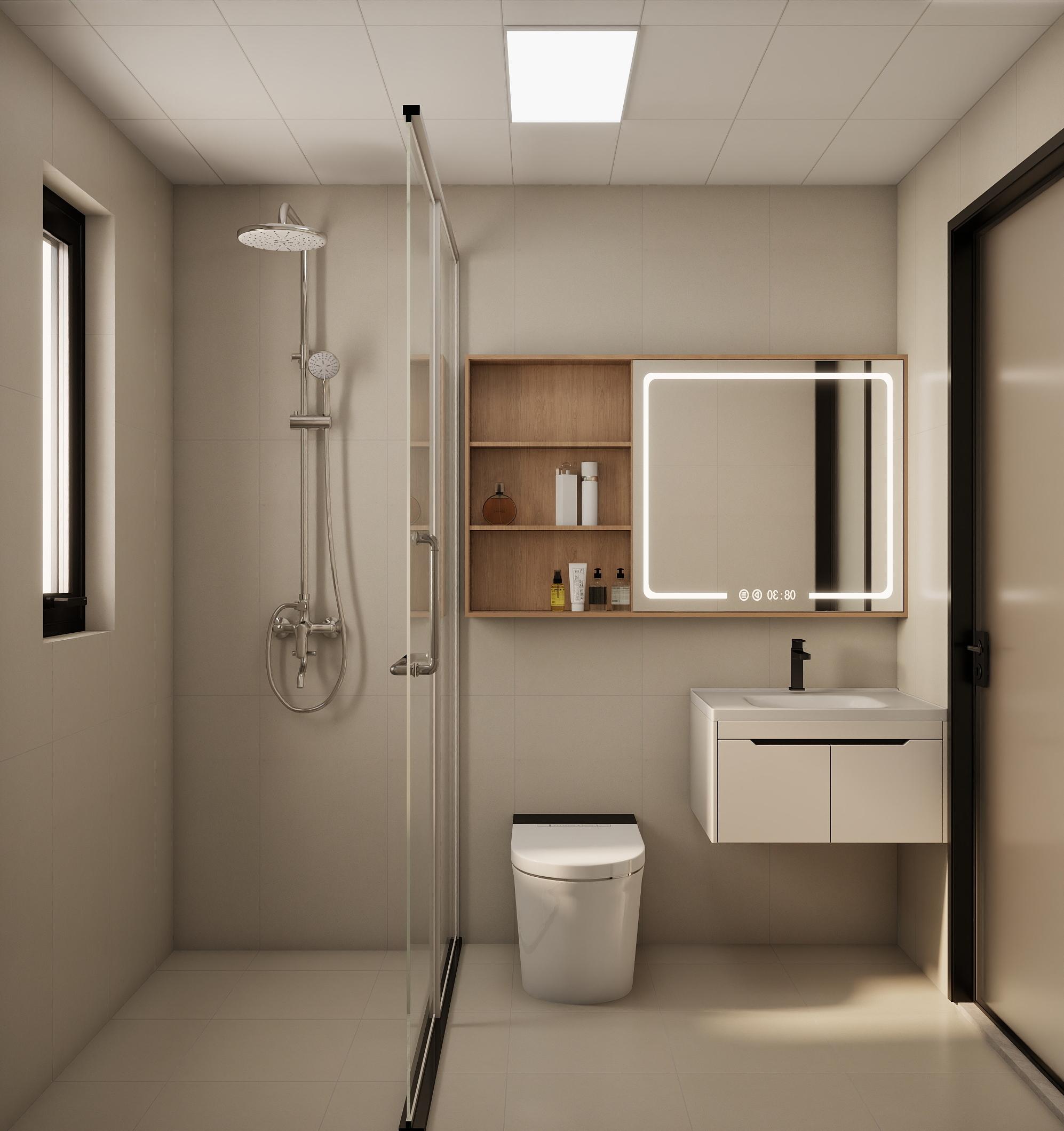 衛(wèi)生間風(fēng)格統(tǒng)一,淺色瓷磚通鋪,搭配黑色五金件,呈現(xiàn)干凈利落的現(xiàn)代感。玻璃淋浴房實(shí)現(xiàn)干濕分離;智能馬桶與鏡柜提升便利性;壁龕與懸空洗手臺(tái)增加儲(chǔ)物空間,減少衛(wèi)生死角。