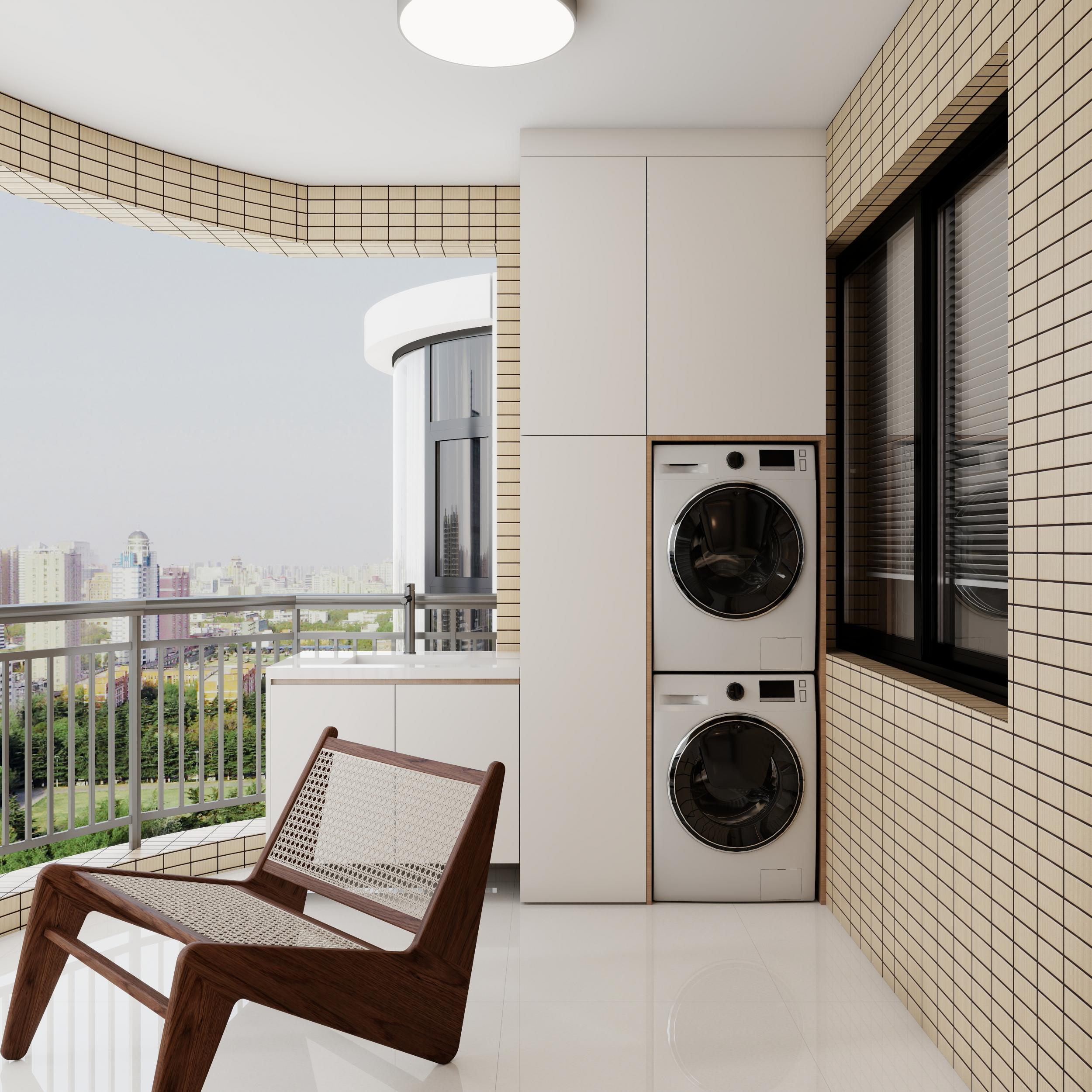 定制柜嵌入洗衣機(jī)與烘干機(jī),打造高效家政區(qū);休閑椅提供觀景角落,兼顧實(shí)用與放松。小瓷磚墻面防污易清潔,淺色系與室內(nèi)風(fēng)格呼應(yīng),保持整體協(xié)調(diào)性。