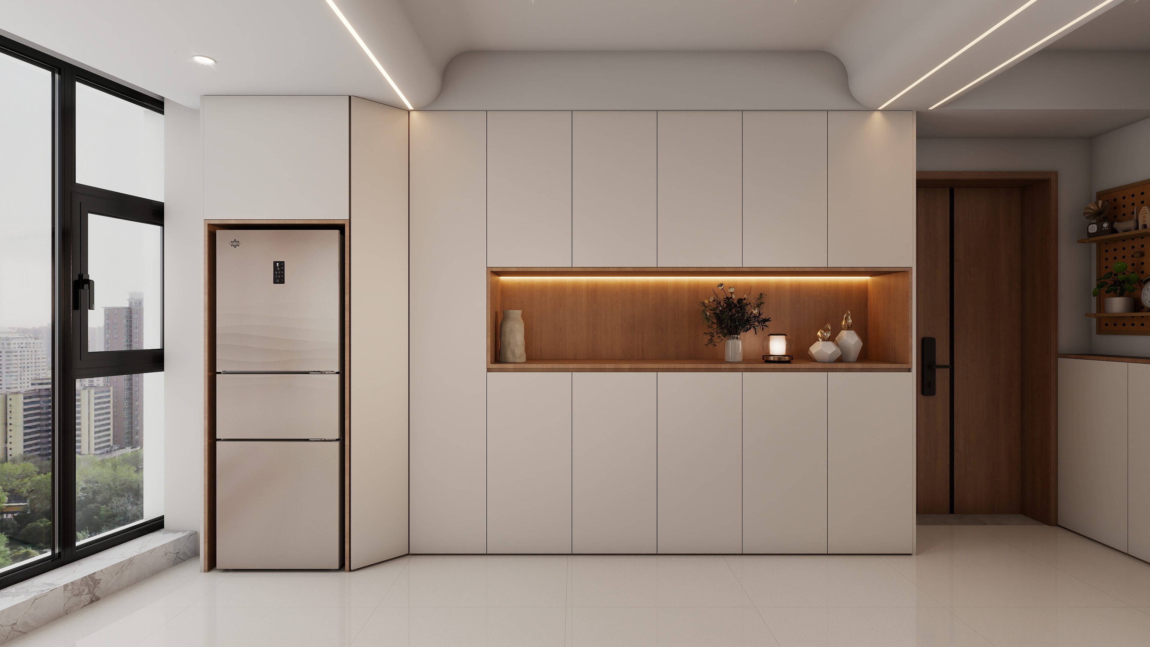 嵌入式家電,冰箱與柜體無縫融合,節(jié)省空間且視覺整齊,強(qiáng)化廚房-餐廳動(dòng)線的連貫性。開放格內(nèi)置燈帶,形成柔和的展示區(qū),可擺放花藝、裝飾品或常用小物,兼顧實(shí)用性與裝飾性;燈帶設(shè)計(jì)提升空間精致度。與玄關(guān)柜統(tǒng)一設(shè)計(jì)語言,保持外觀簡(jiǎn)潔,同時(shí)減少磕碰風(fēng)險(xiǎn)。