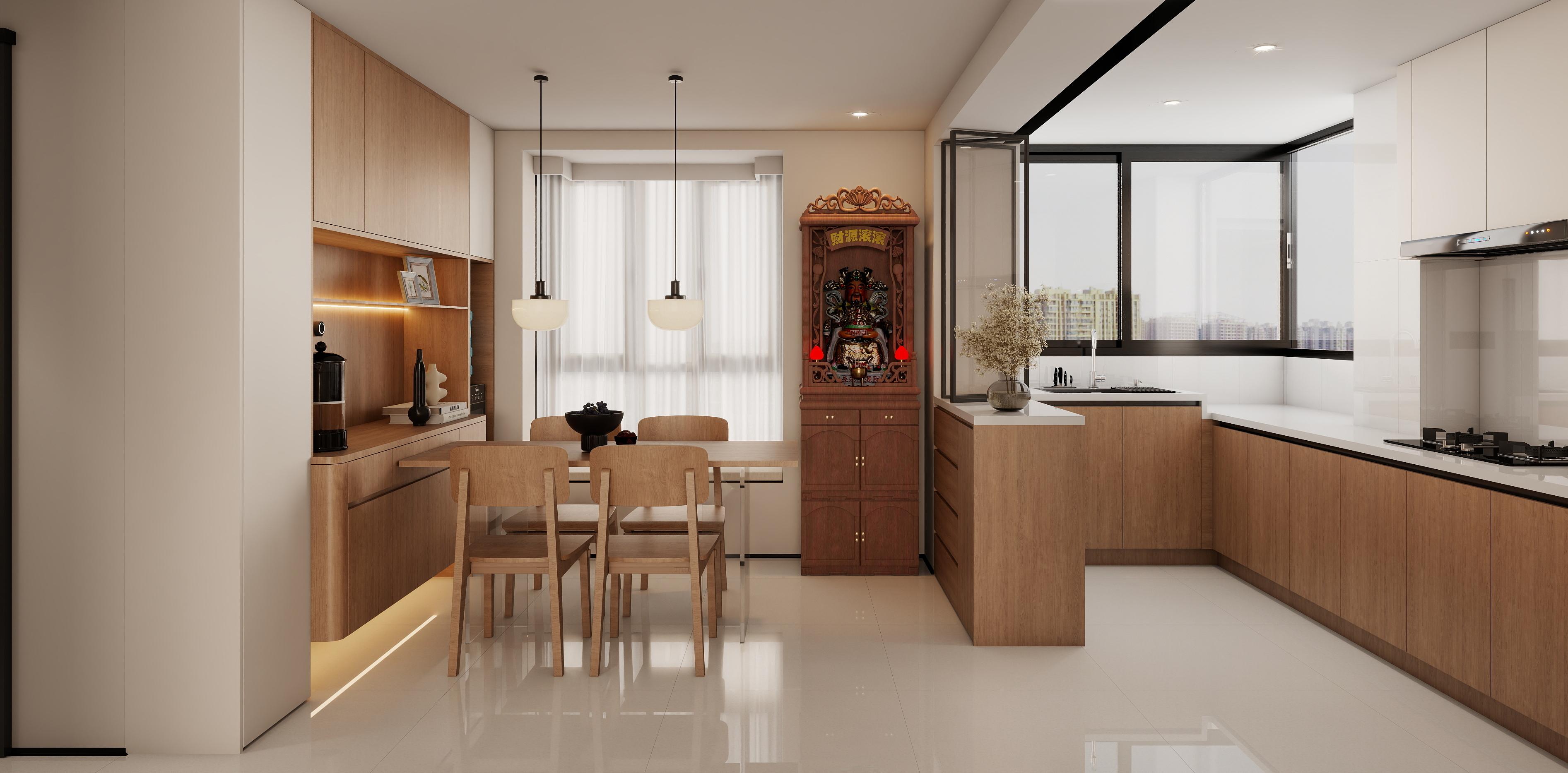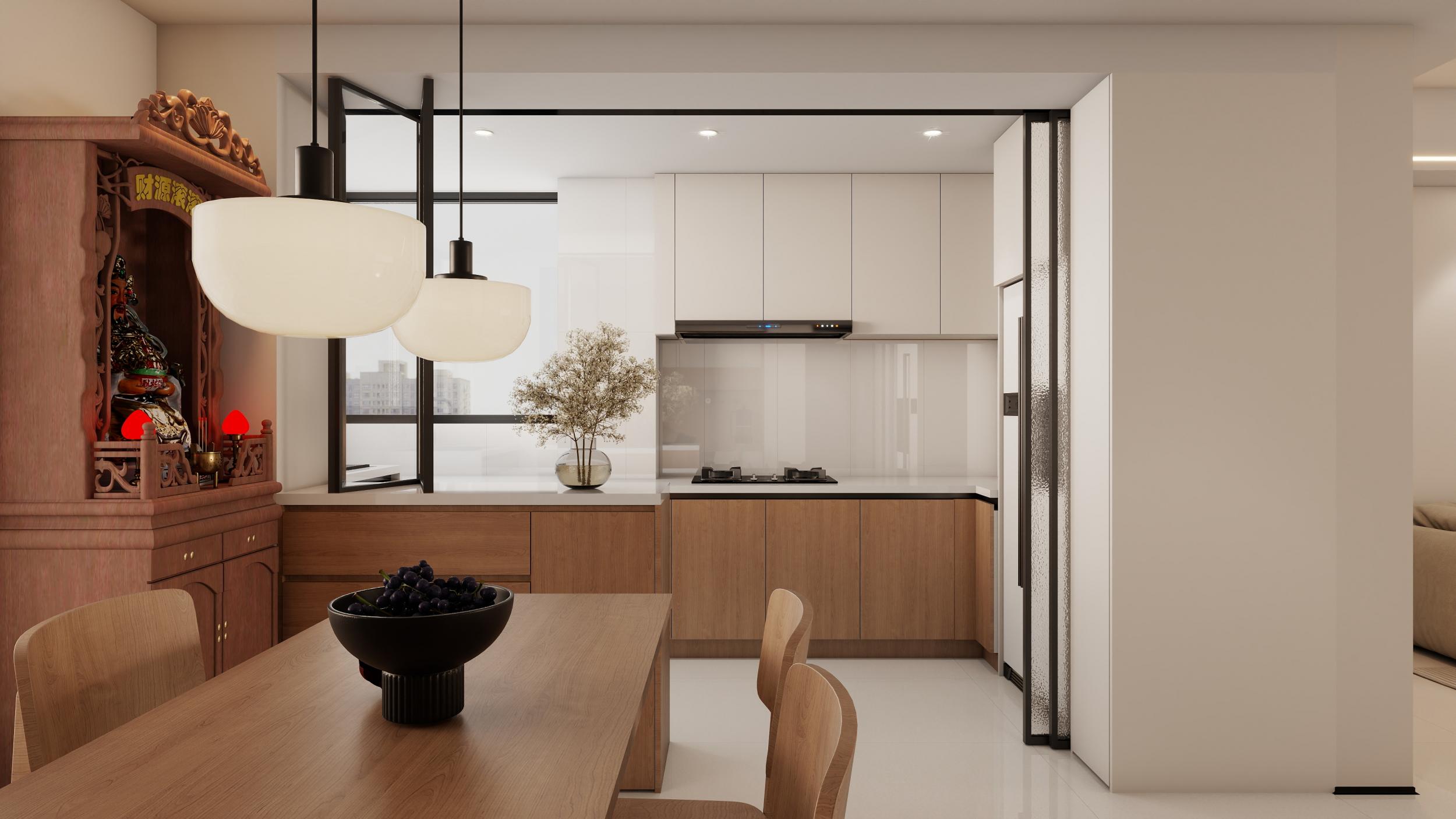 開放式聯(lián)動(dòng),餐廳與廚房無硬質(zhì)隔斷,僅以折疊窗靈活分隔,既保證烹飪時(shí)的油煙隔離,又保持空間通透感,促進(jìn)家庭成員互動(dòng)。窗臺(tái)上的干花裝飾成為視覺過渡點(diǎn),弱化功能分區(qū)界限。L型廚房操作臺(tái)與餐桌緊鄰,形成“備餐-用餐”高效動(dòng)線,符合日常使用邏輯。