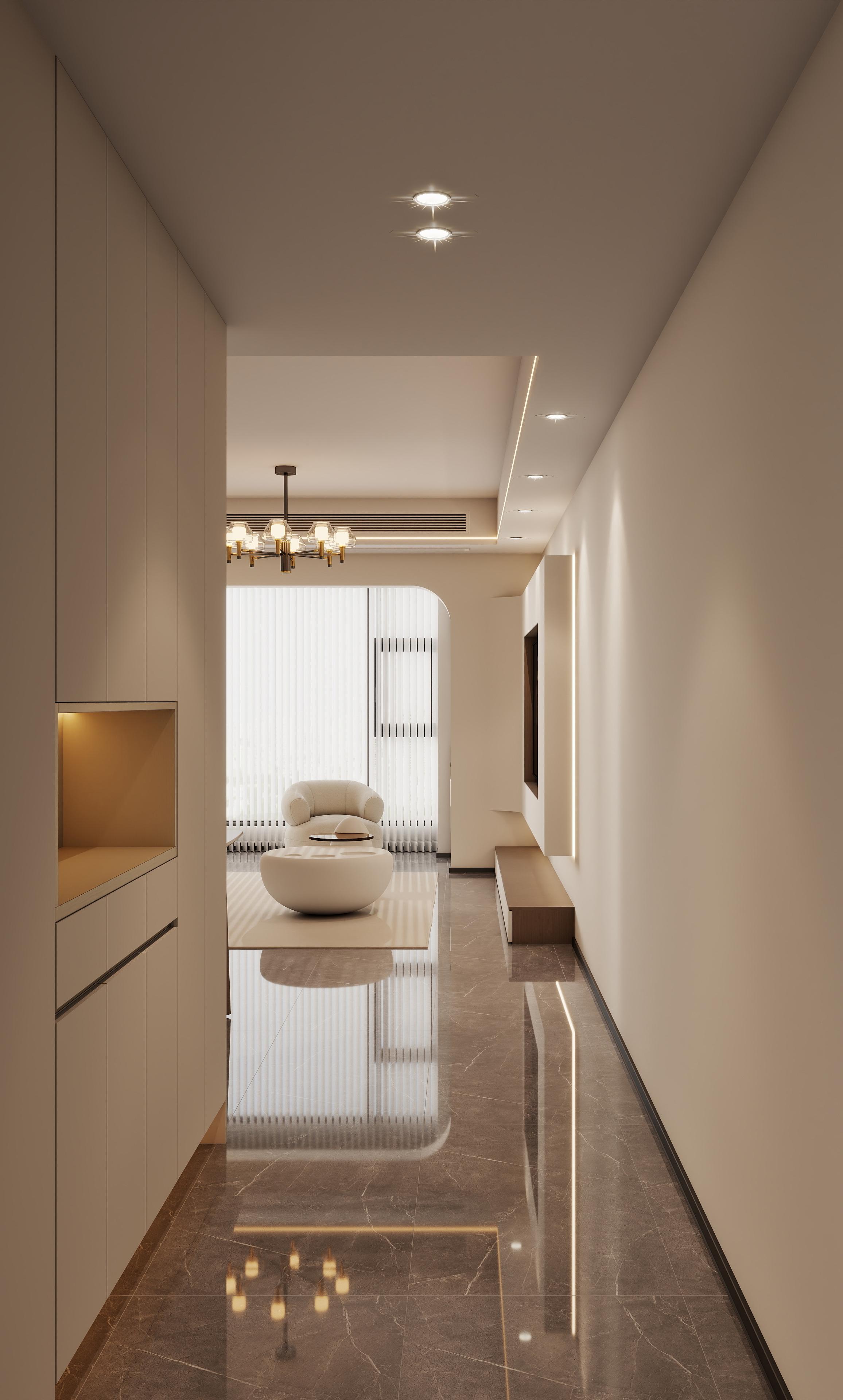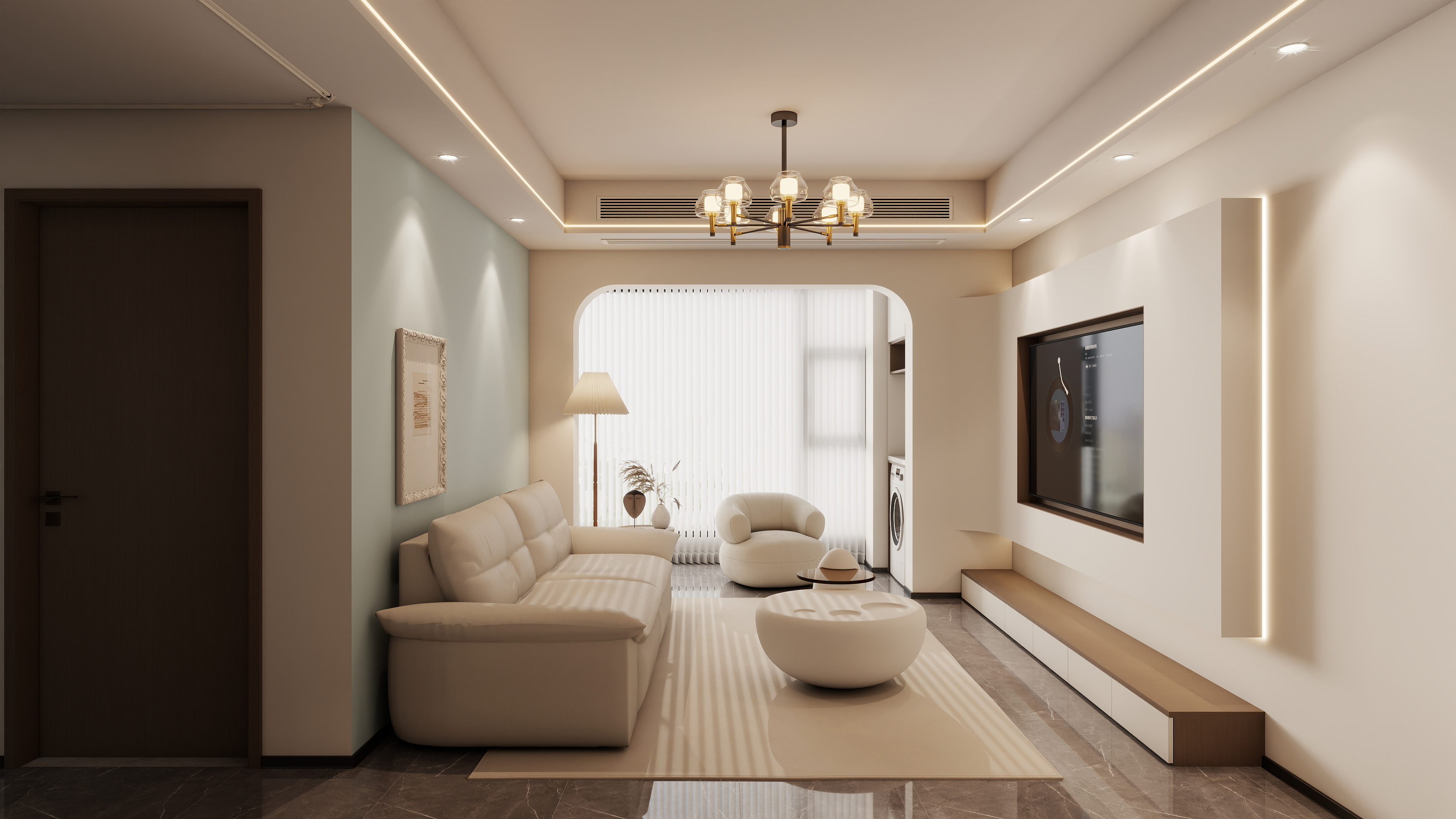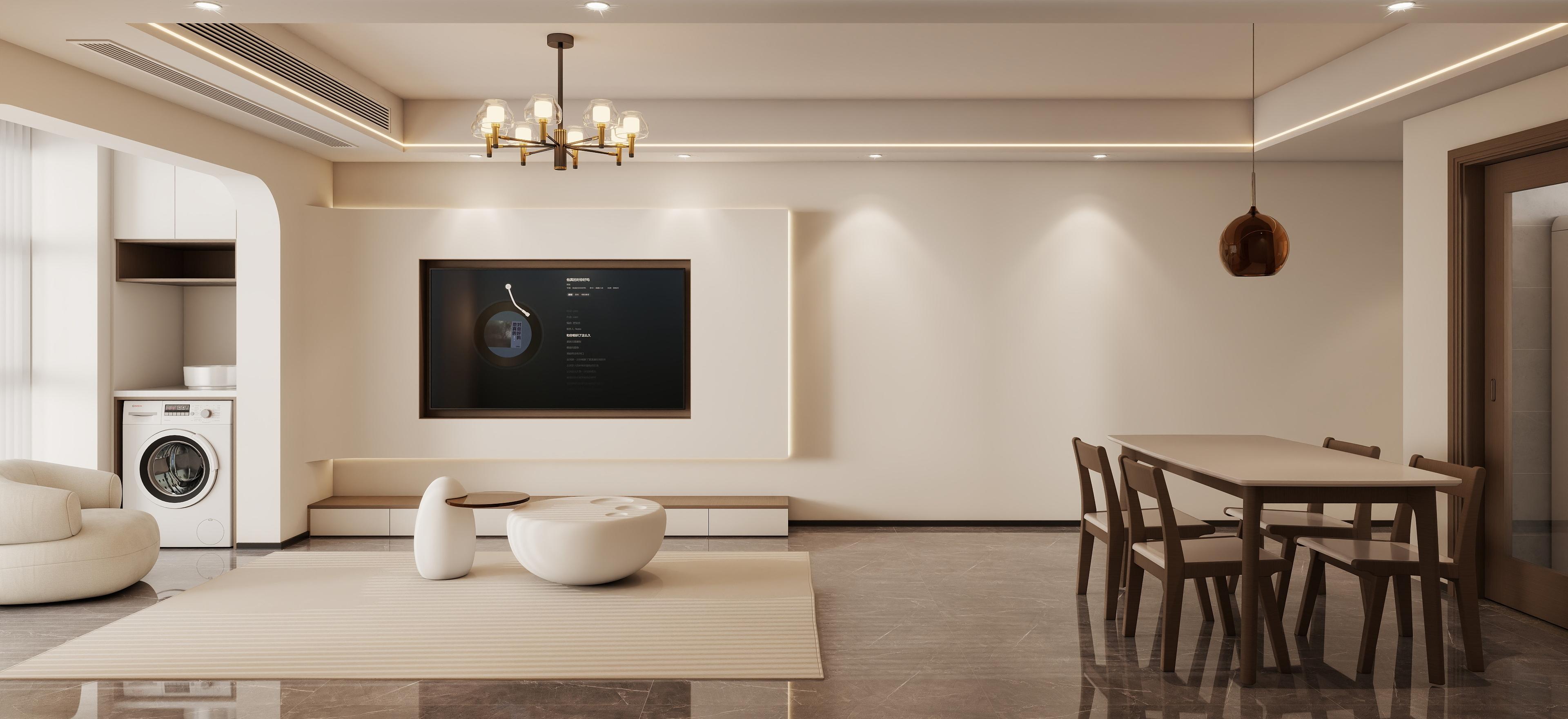 客廳:以米色、淺木色為主基調(diào),搭配淺藍(lán)灰墻面點(diǎn)綴,營(yíng)造溫暖而不失層次感的視覺(jué)效果。地面采用深灰大理石瓷磚,提升空間質(zhì)感。淺米色沙發(fā)搭配圓形白色茶幾,線(xiàn)條柔和,增強(qiáng)互動(dòng)性;沙發(fā)背景墻掛裝飾畫(huà),避免單調(diào)。電視墻內(nèi)嵌設(shè)計(jì),整合洗衣機(jī)區(qū)域,兼顧實(shí)用與美觀。隱藏式燈帶勾勒天花板輪廓,搭配復(fù)古玻璃吊燈,提供多層次光線(xiàn),營(yíng)造溫馨氛圍。拱形門(mén)洞連接陽(yáng)臺(tái),引入充足自然光,同時(shí)柔化空間棱角;落地?zé)襞c干花裝飾增添生活氣息。