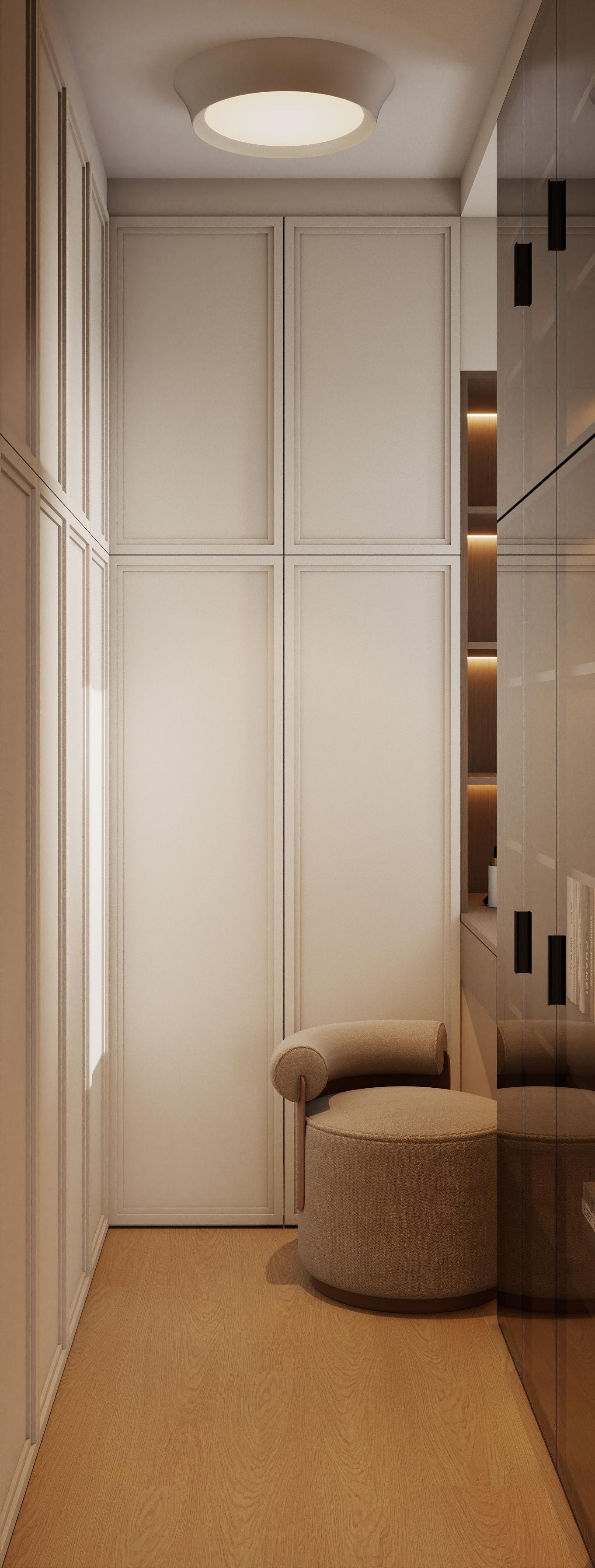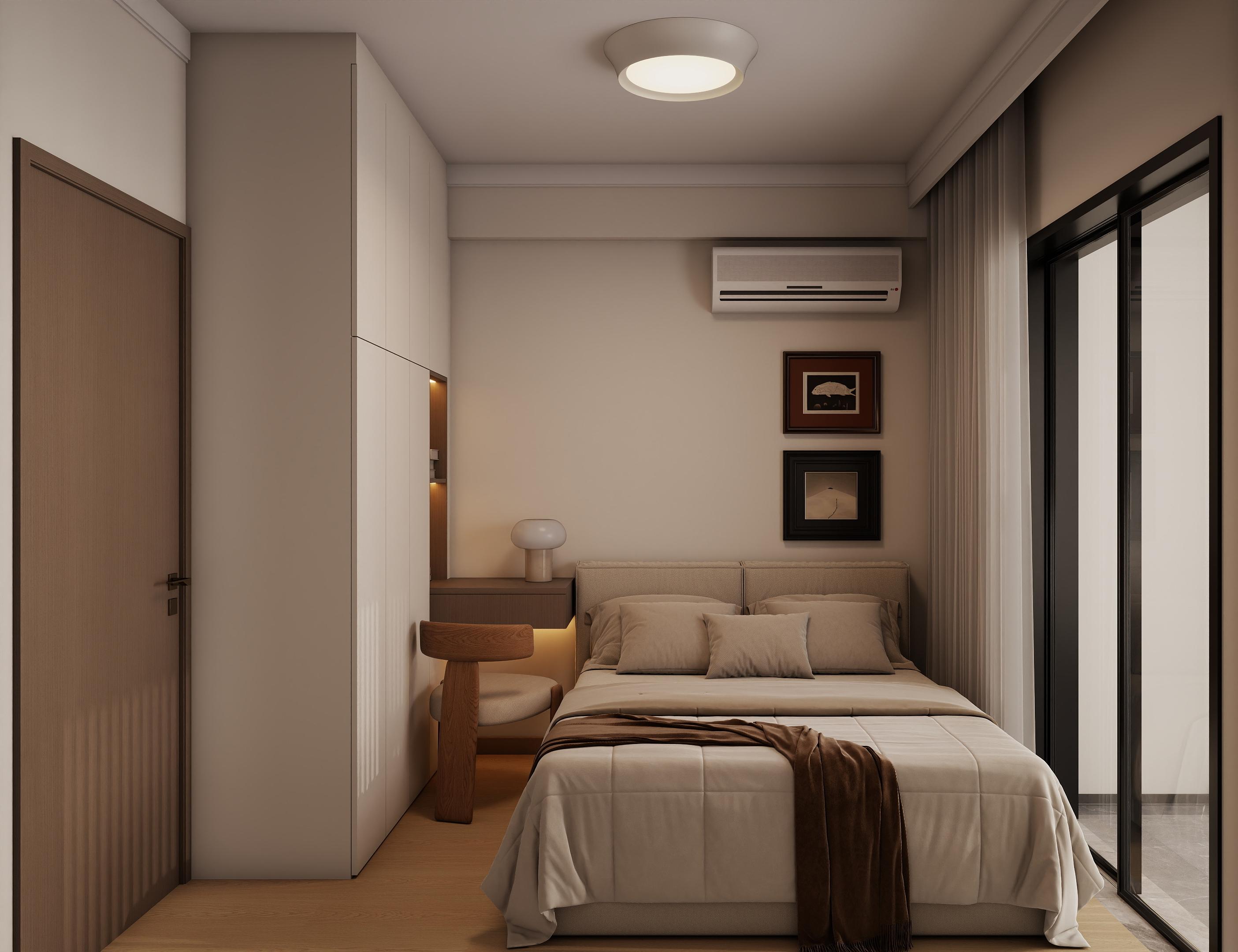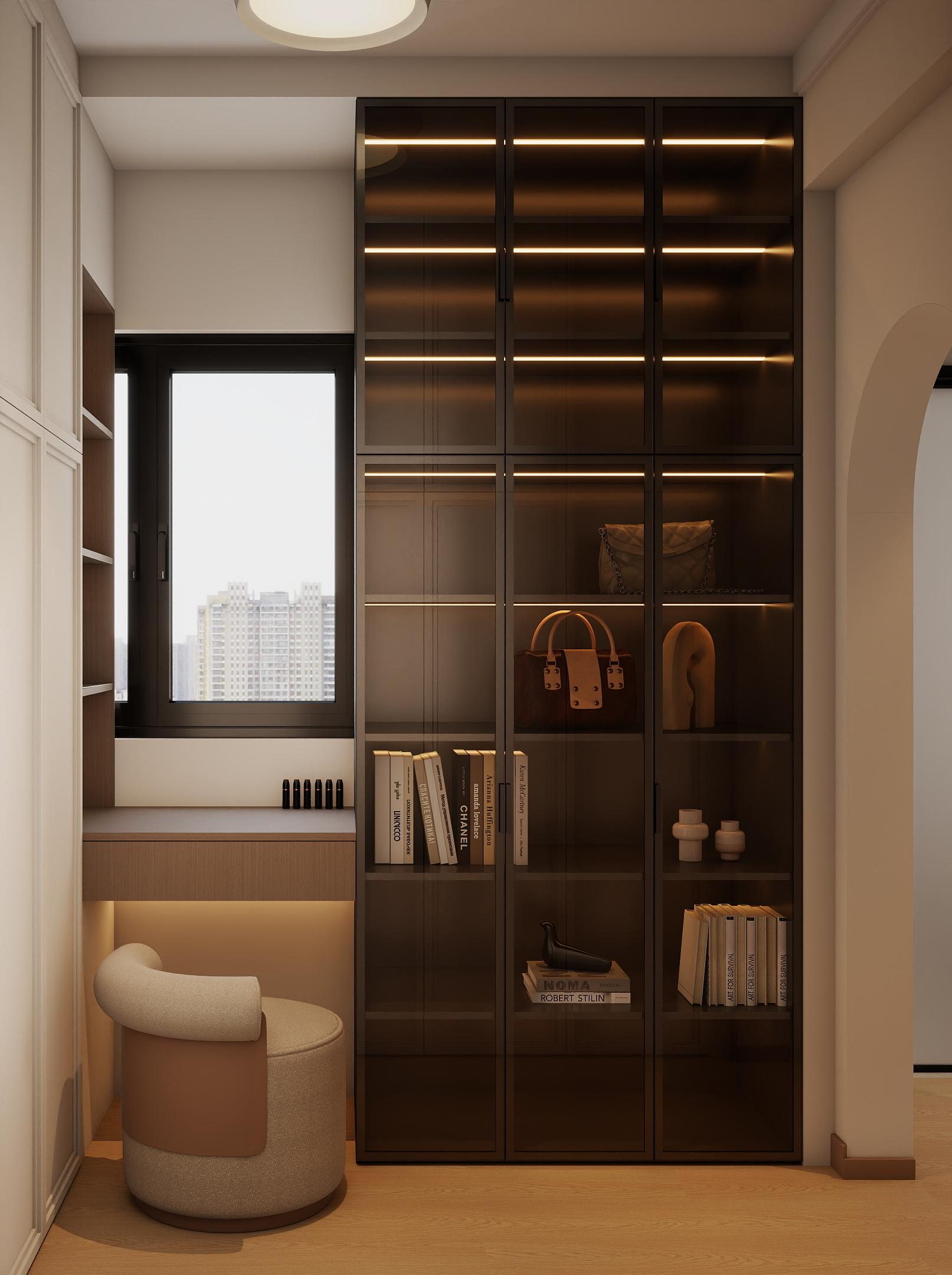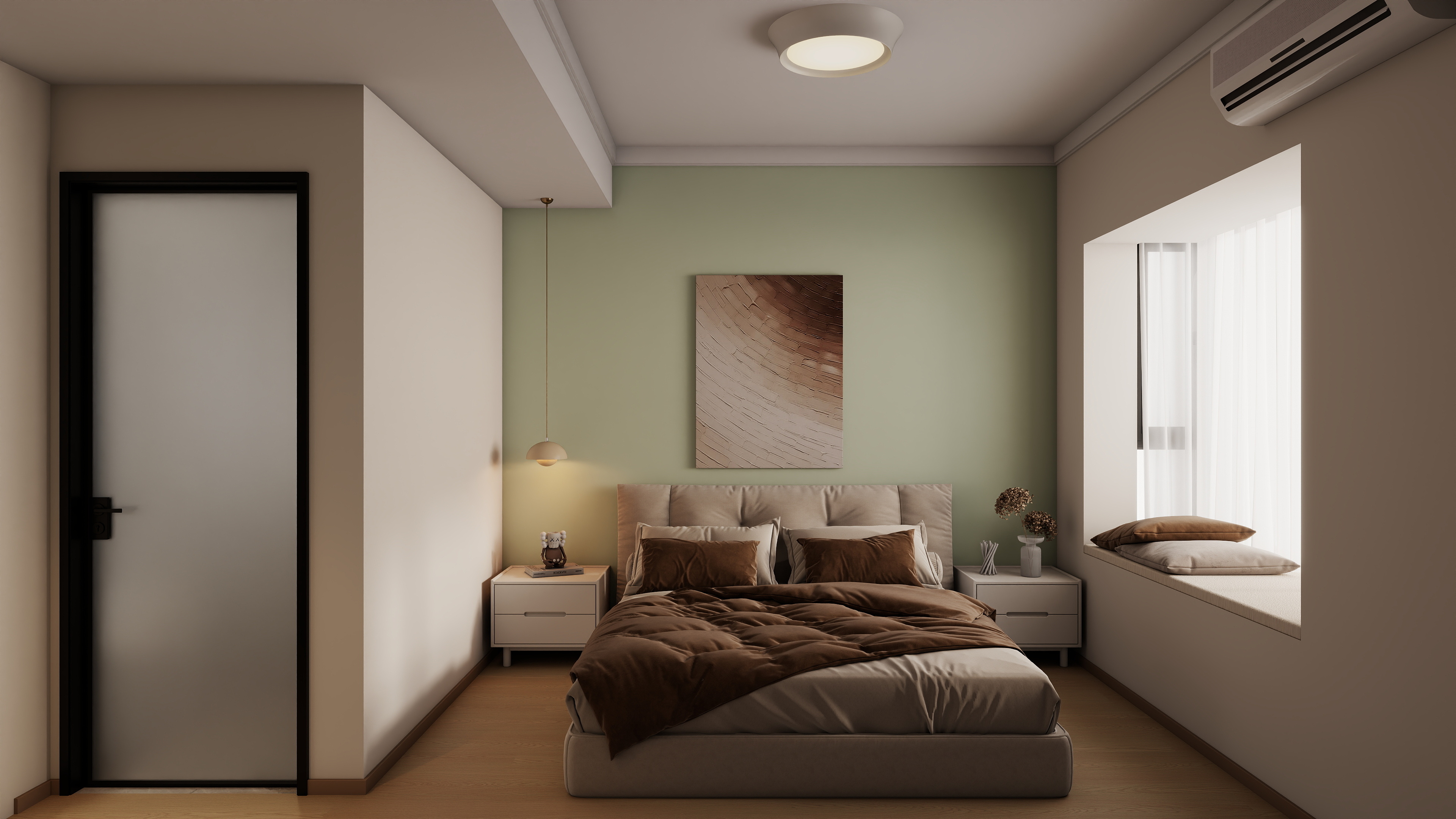 臥室:淺綠背景墻搭配米色軟包床,營(yíng)造自然放松的睡眠環(huán)境;深棕色床品與吊燈形成色彩呼應(yīng)。飄窗設(shè)計(jì)為休閑角,增加空間功能性。定制一體式衣柜與書(shū)桌或梳妝臺(tái),節(jié)省空間;玻璃柜門(mén)增強(qiáng)通透感,內(nèi)置燈帶提升使用便利性。淺木地板與暖白柜體搭配,保持整體風(fēng)格統(tǒng)一。