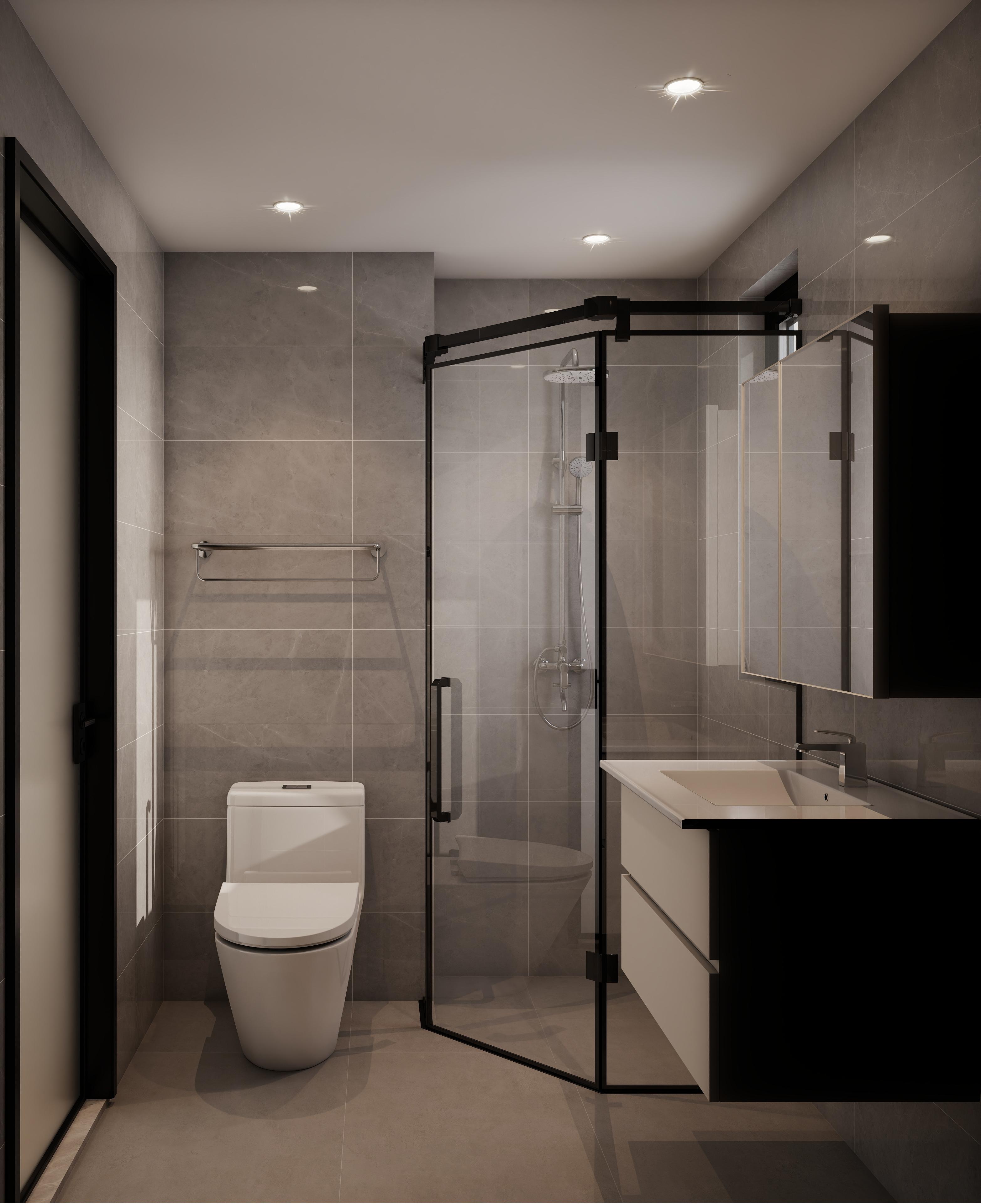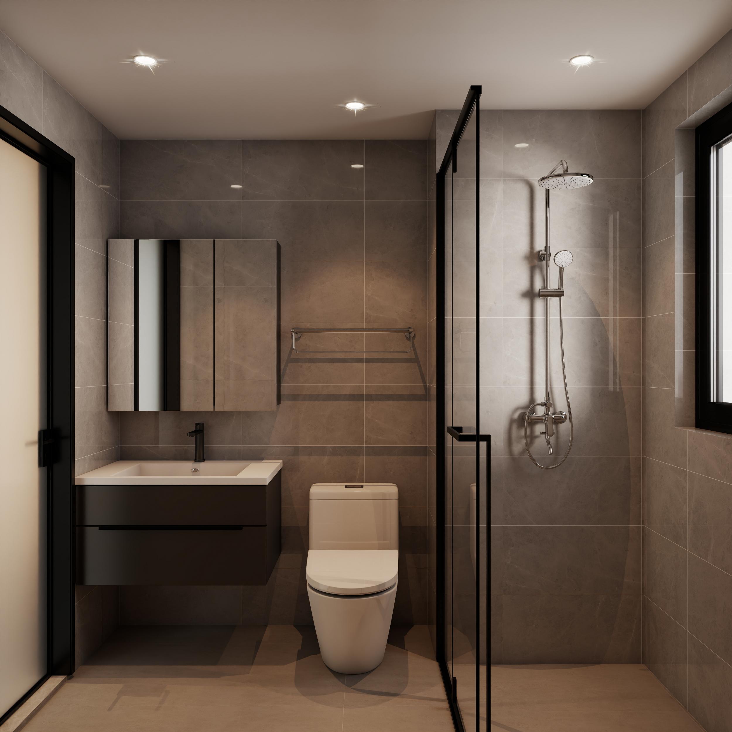 衛(wèi)生間:干濕分離與現(xiàn)代質(zhì)感,玻璃淋浴房實(shí)現(xiàn)干濕分區(qū),黑色金屬邊框增添輕奢感;壁掛式馬桶節(jié)省空間,便于清潔?;疑麓罄硎纱u鋪貼墻面與地面,耐臟且顯高級(jí);鏡柜設(shè)計(jì)增加儲(chǔ)物空間,保持臺(tái)面整潔。嵌入式筒燈提供充足照明,淋浴區(qū)花灑與置物架布局合理,兼顧實(shí)用性與美觀。