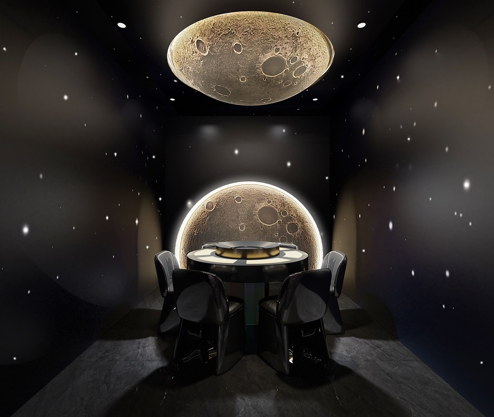 宇宙探秘風:以黑色為主色調,搭配星星點點的燈光,模擬浩瀚宇宙。巨大的月球吊燈成為視覺中心,營造出神秘深邃的氛圍,讓玩家仿佛置身宇宙空間,非常適合科幻、懸疑類劇本,激發(fā)玩家的探索欲與想象力。