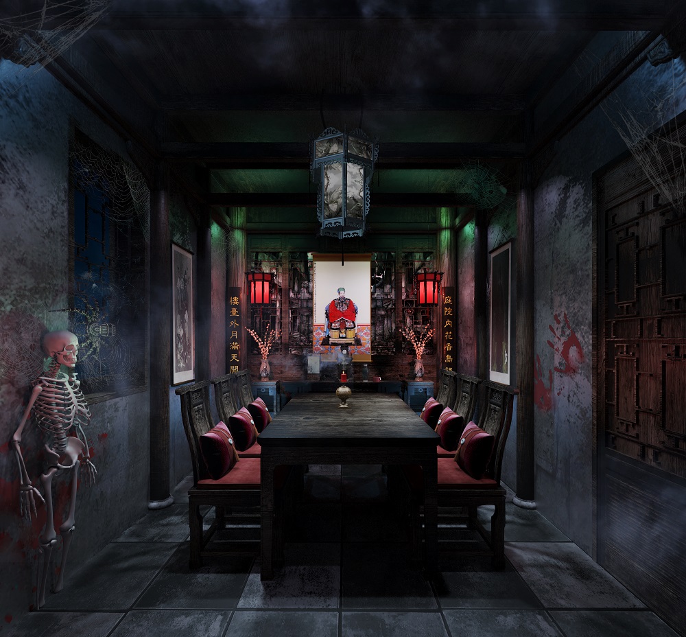 中式恐怖風:通過昏暗光線、蜘蛛網、骷髏模型、中式神龕等元素,營造出陰森恐怖的氛圍,為恐怖類劇本增添緊張刺激感。