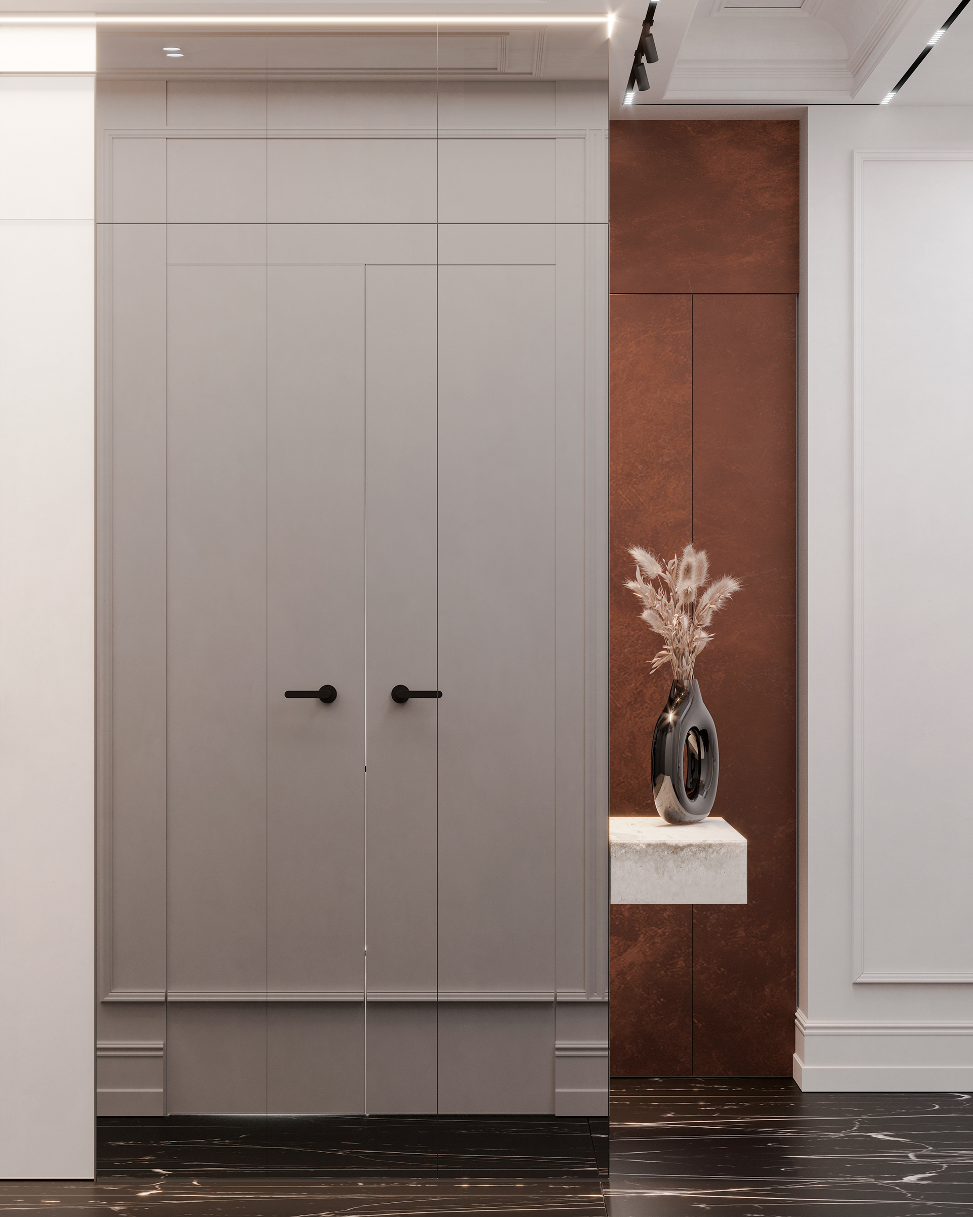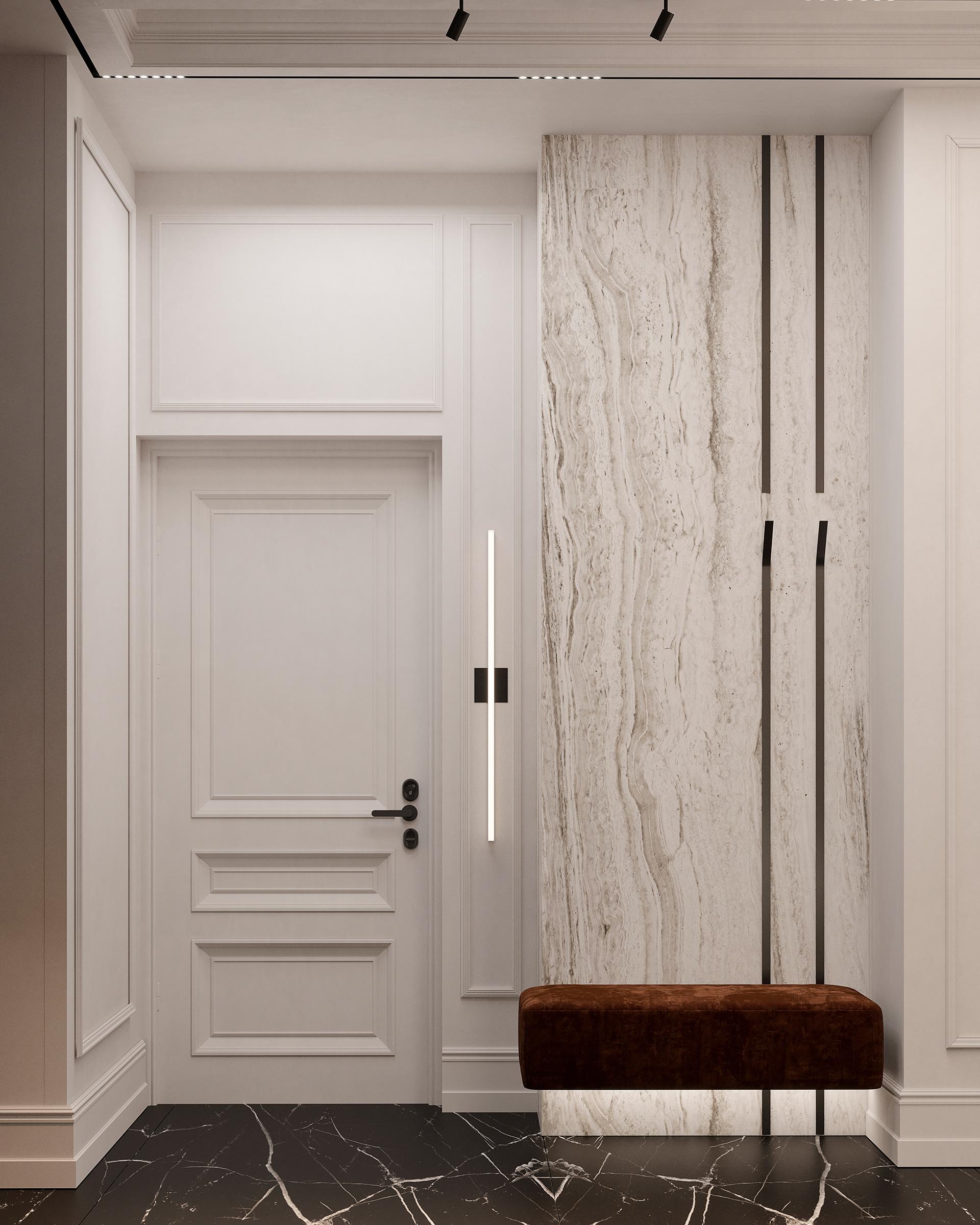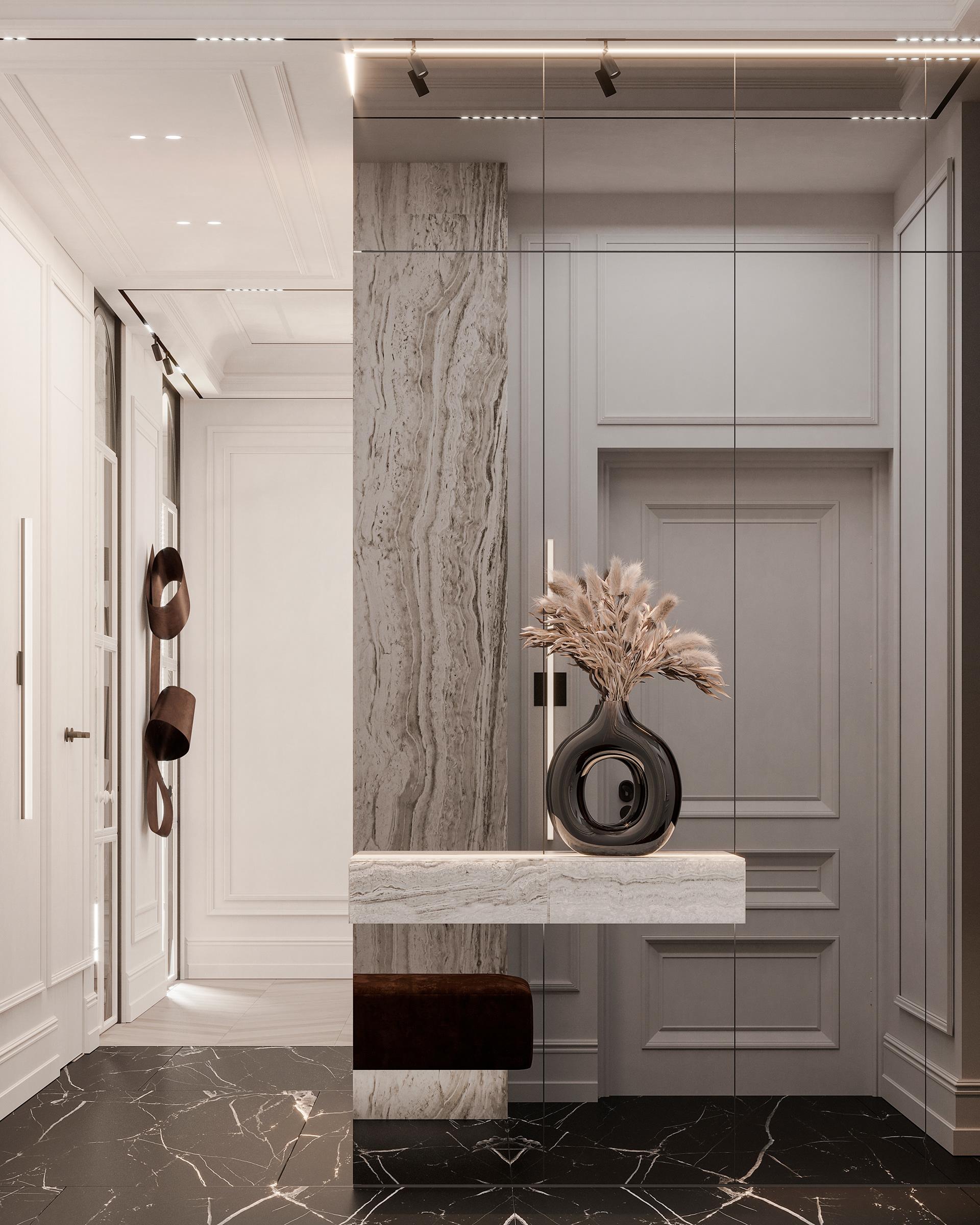 玄關(guān):以大理石材質(zhì)打造端景臺,其獨特的紋理自然且富有藝術(shù)感,搭配深棕色的換鞋凳,形成材質(zhì)與色彩的對比。黑色花瓶中插置的干草裝飾,增添了自然氣息與藝術(shù)氛圍,一進(jìn)門便給人以優(yōu)雅的視覺感受。利用玻璃隔斷進(jìn)行空間劃分,既保證了玄關(guān)的獨立性,又不會讓空間顯得封閉壓抑,同時玻璃的反射特性還能增加空間的通透感和視覺延伸性。