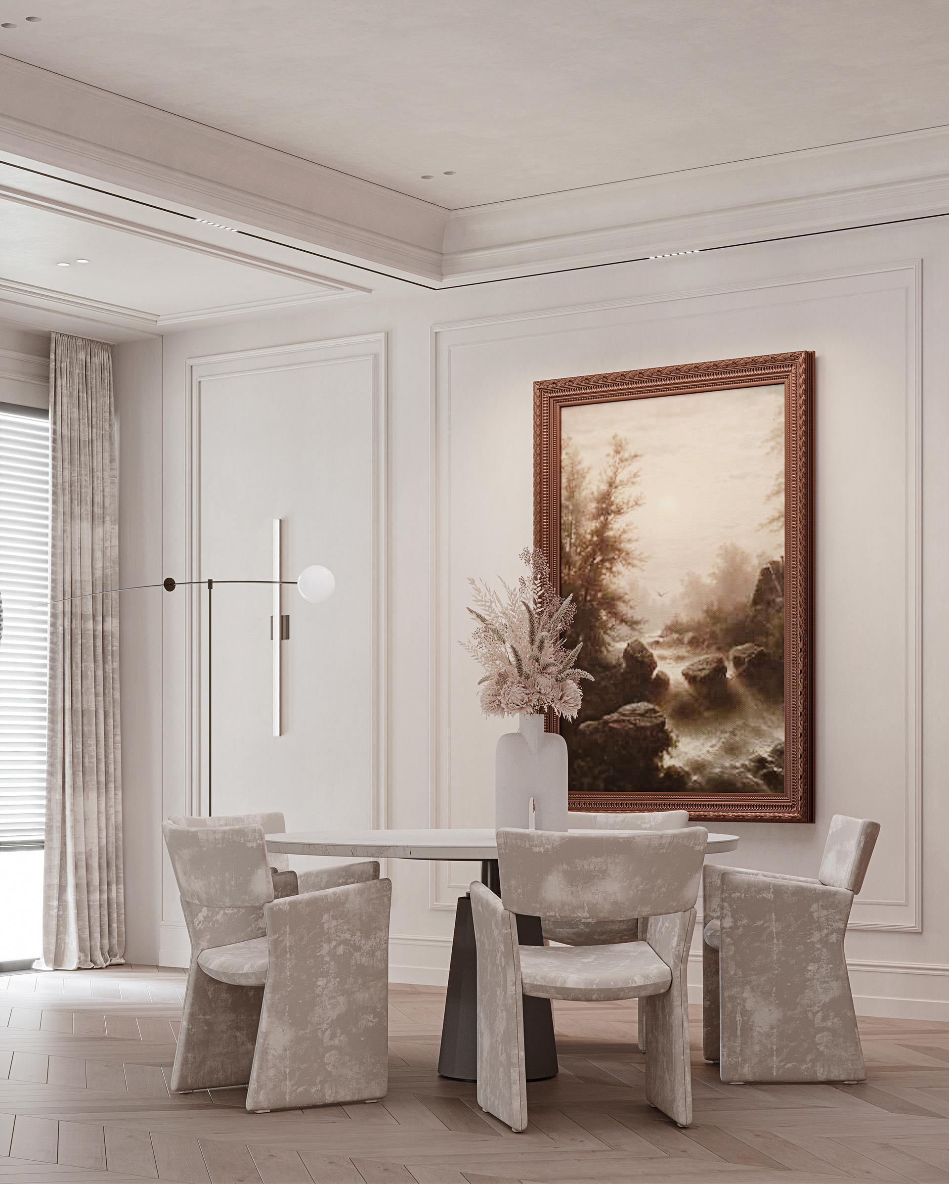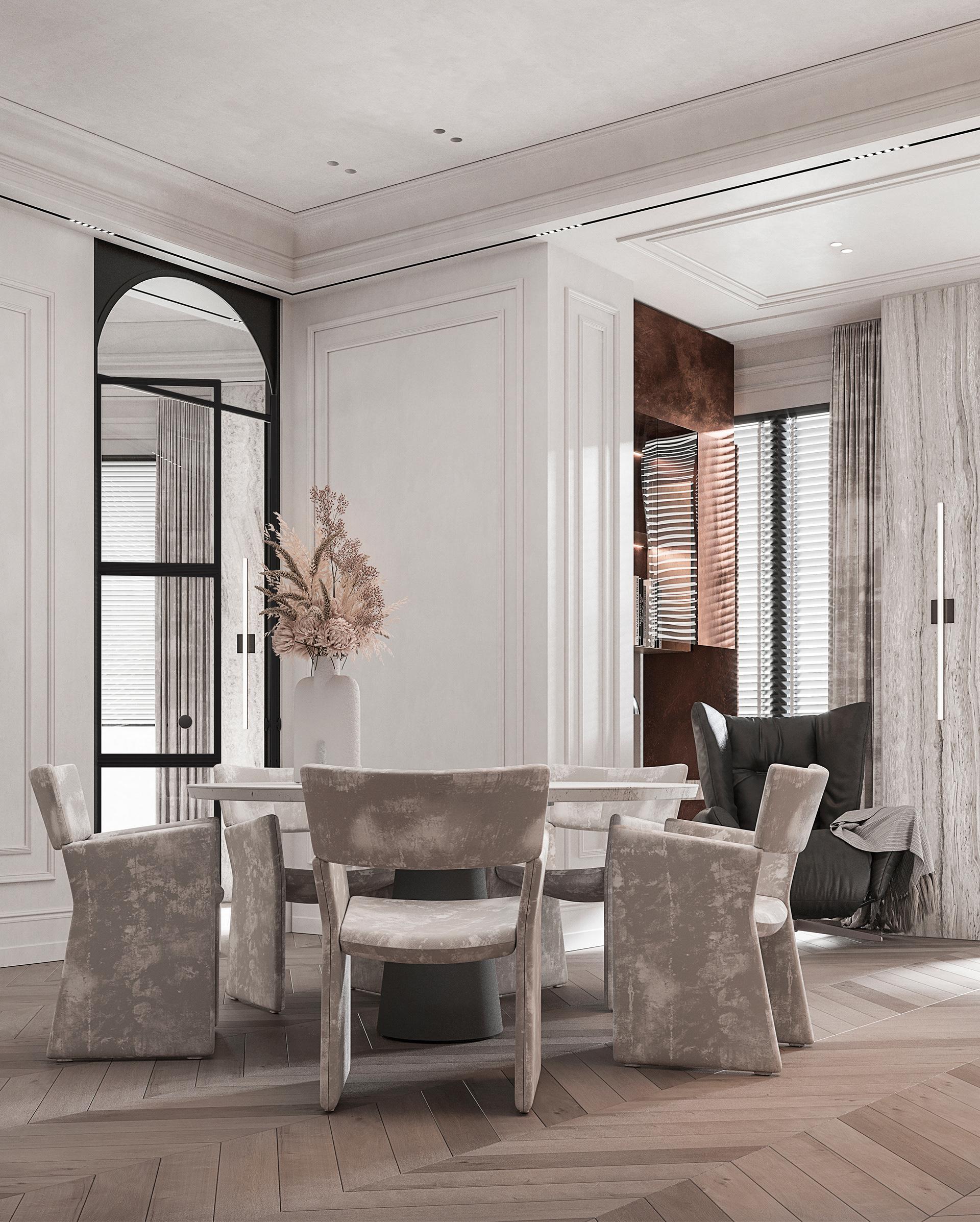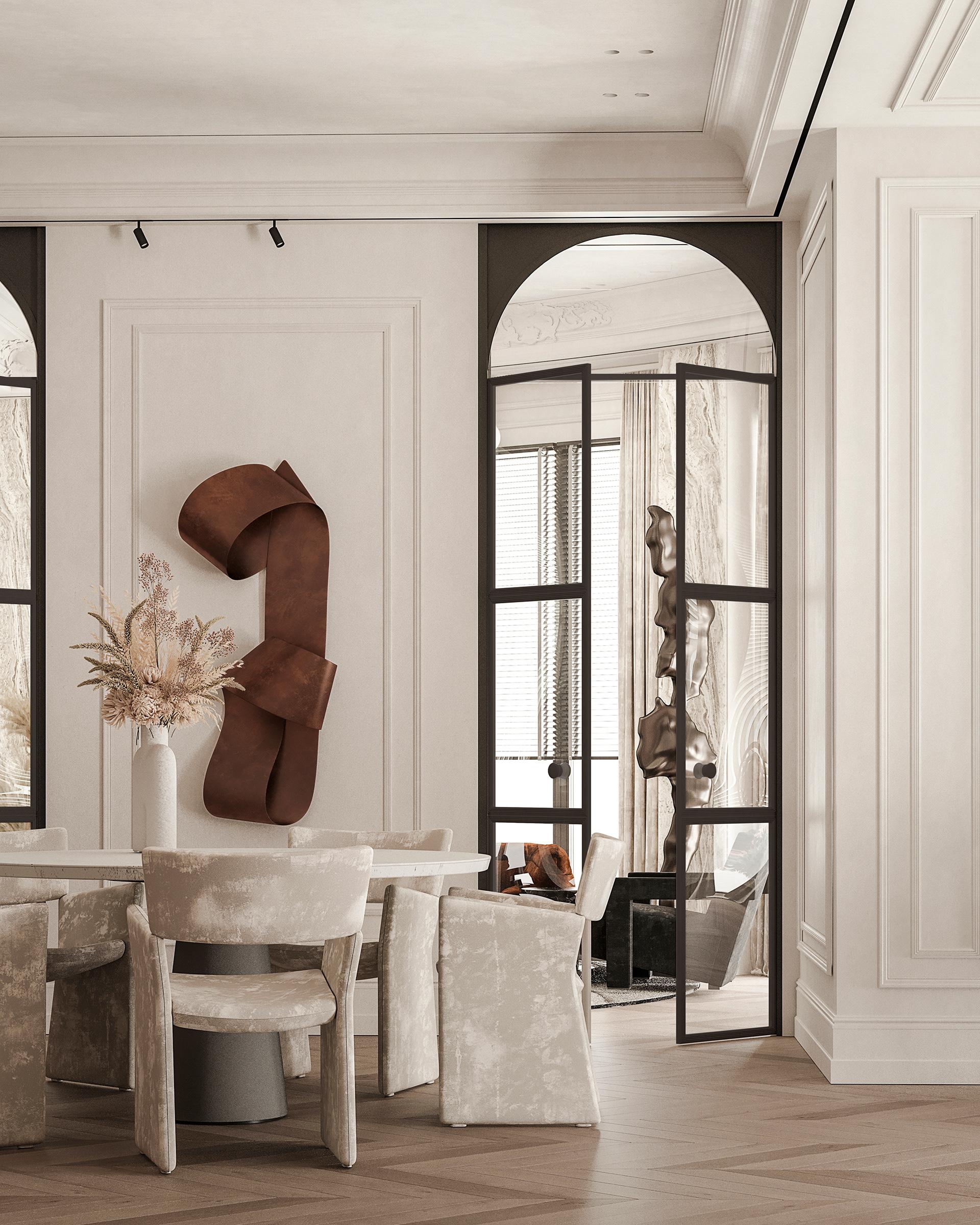 餐廳:白色的圓形餐桌搭配淺灰色帶有紋理的餐椅,色彩柔和統(tǒng)一,造型簡約時尚。餐桌中央擺放的白色花瓶與干花裝飾,增添了自然清新的氣息。墻上的棕色藝術(shù)裝飾品造型獨特,成為餐廳的視覺亮點,與整體法式風(fēng)格相契合,提升了空間的藝術(shù)格調(diào)。玻璃展示柜中陳列的玻璃器皿等裝飾品,既實用又具有展示性,增加了空間的層次感和精致感。通過拱形玻璃門與相鄰空間相連,保證了空間的流動性和通透感,同時在視覺上形成連貫的整體。