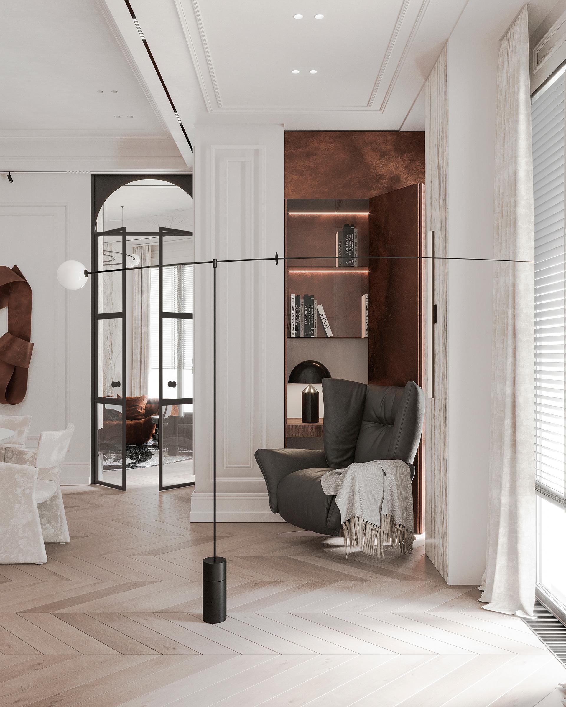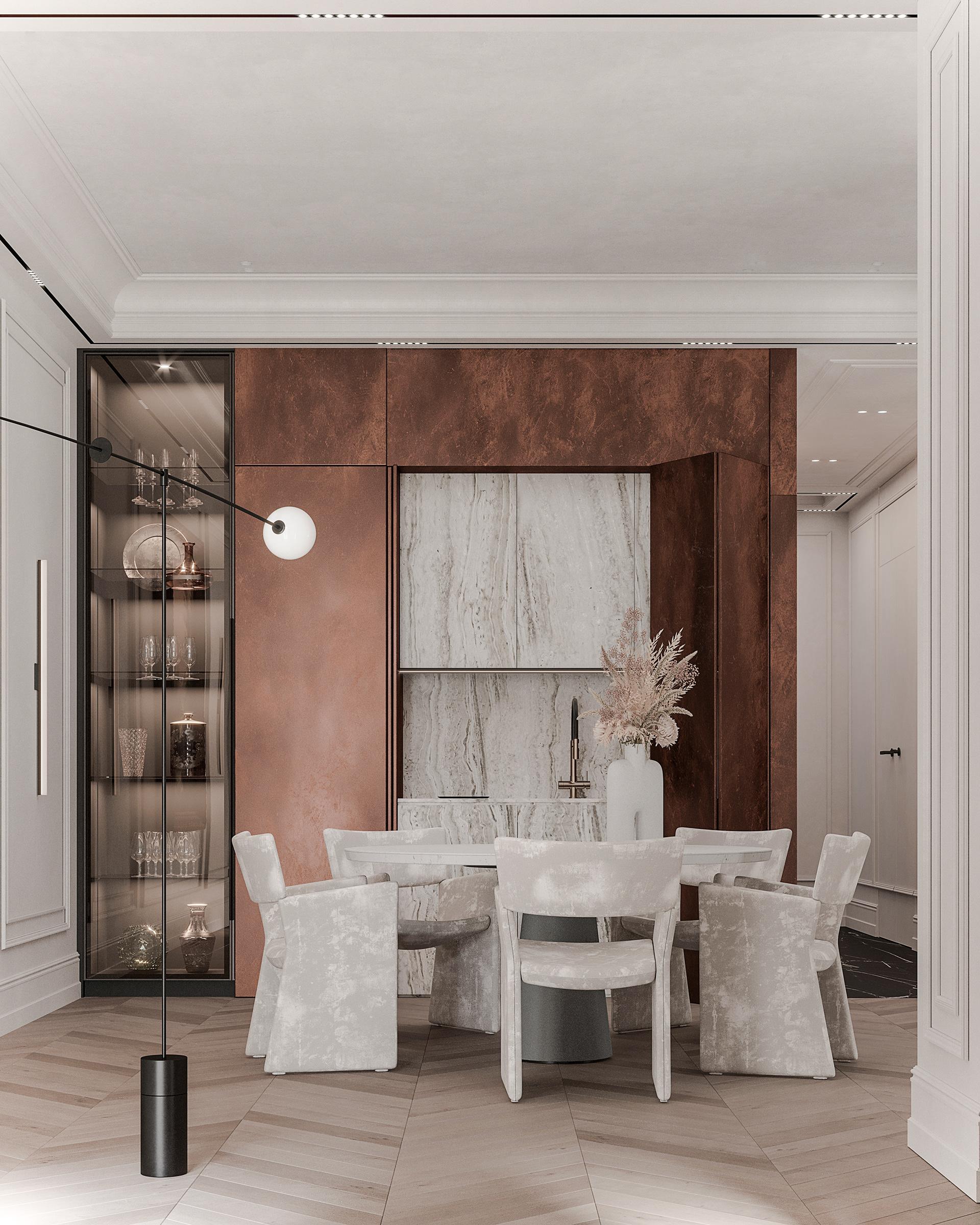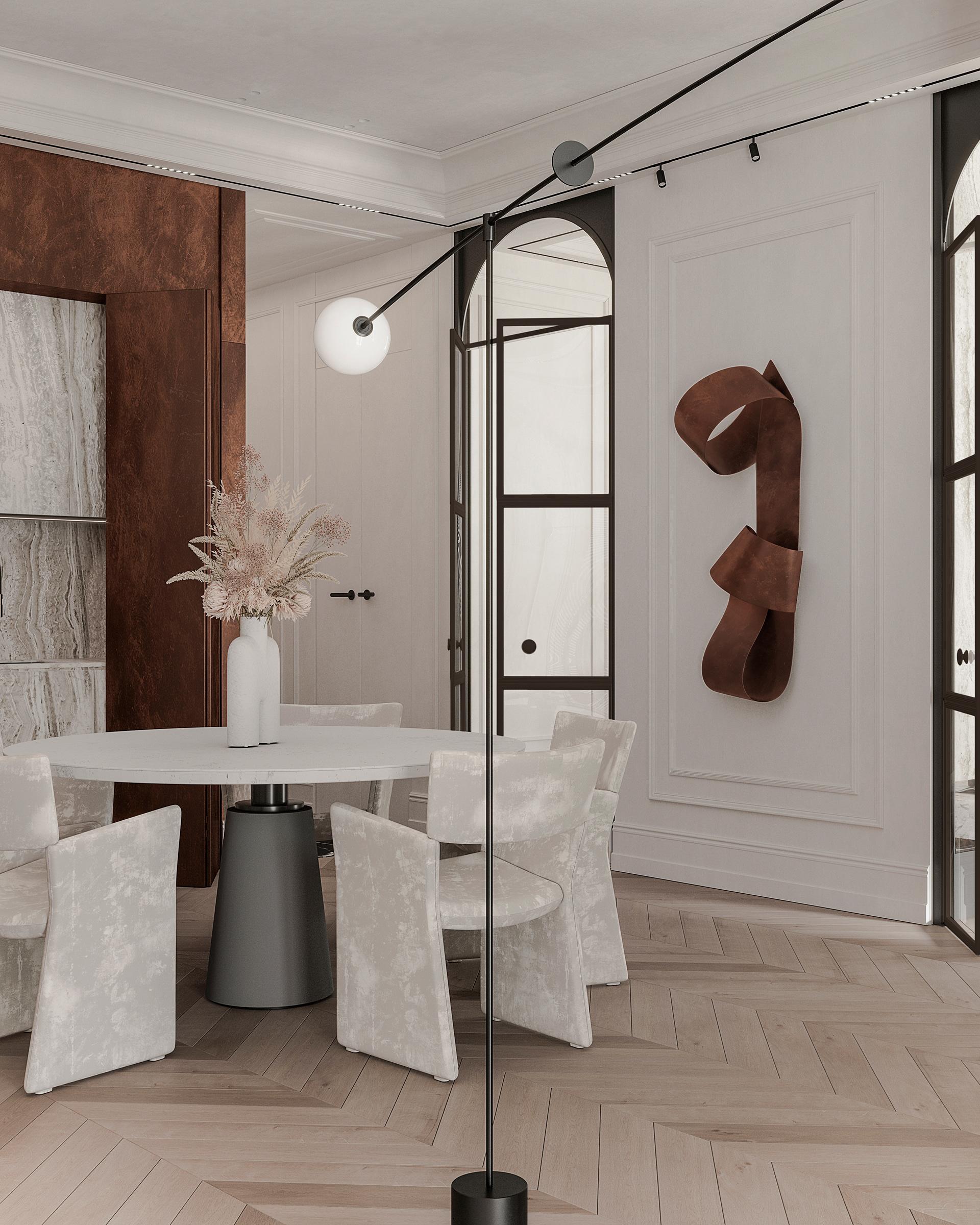 餐廳:白色的圓形餐桌搭配淺灰色帶有紋理的餐椅,色彩柔和統(tǒng)一,造型簡約時尚。餐桌中央擺放的白色花瓶與干花裝飾,增添了自然清新的氣息。墻上的棕色藝術(shù)裝飾品造型獨特,成為餐廳的視覺亮點,與整體法式風(fēng)格相契合,提升了空間的藝術(shù)格調(diào)。玻璃展示柜中陳列的玻璃器皿等裝飾品,既實用又具有展示性,增加了空間的層次感和精致感。通過拱形玻璃門與相鄰空間相連,保證了空間的流動性和通透感,同時在視覺上形成連貫的整體。