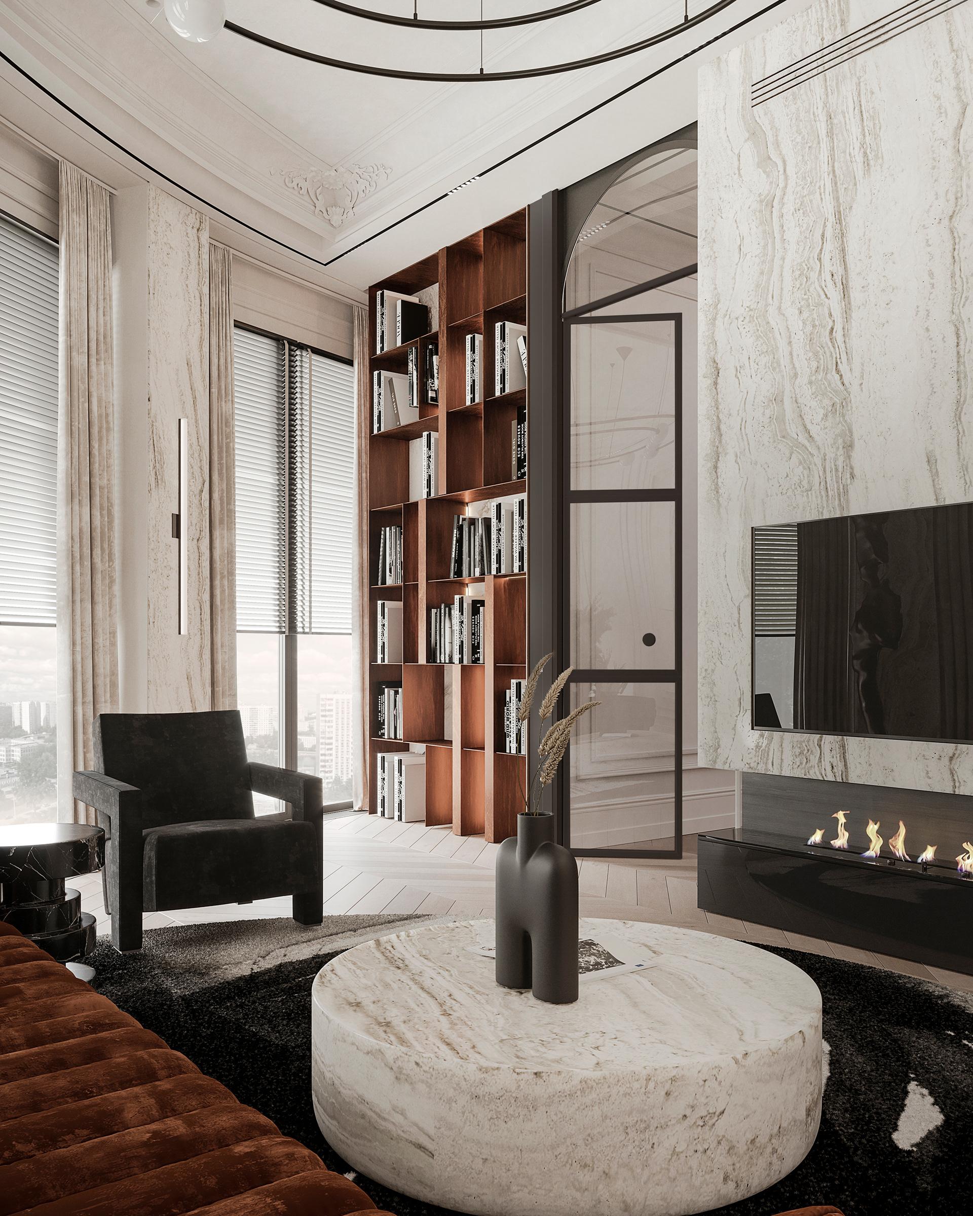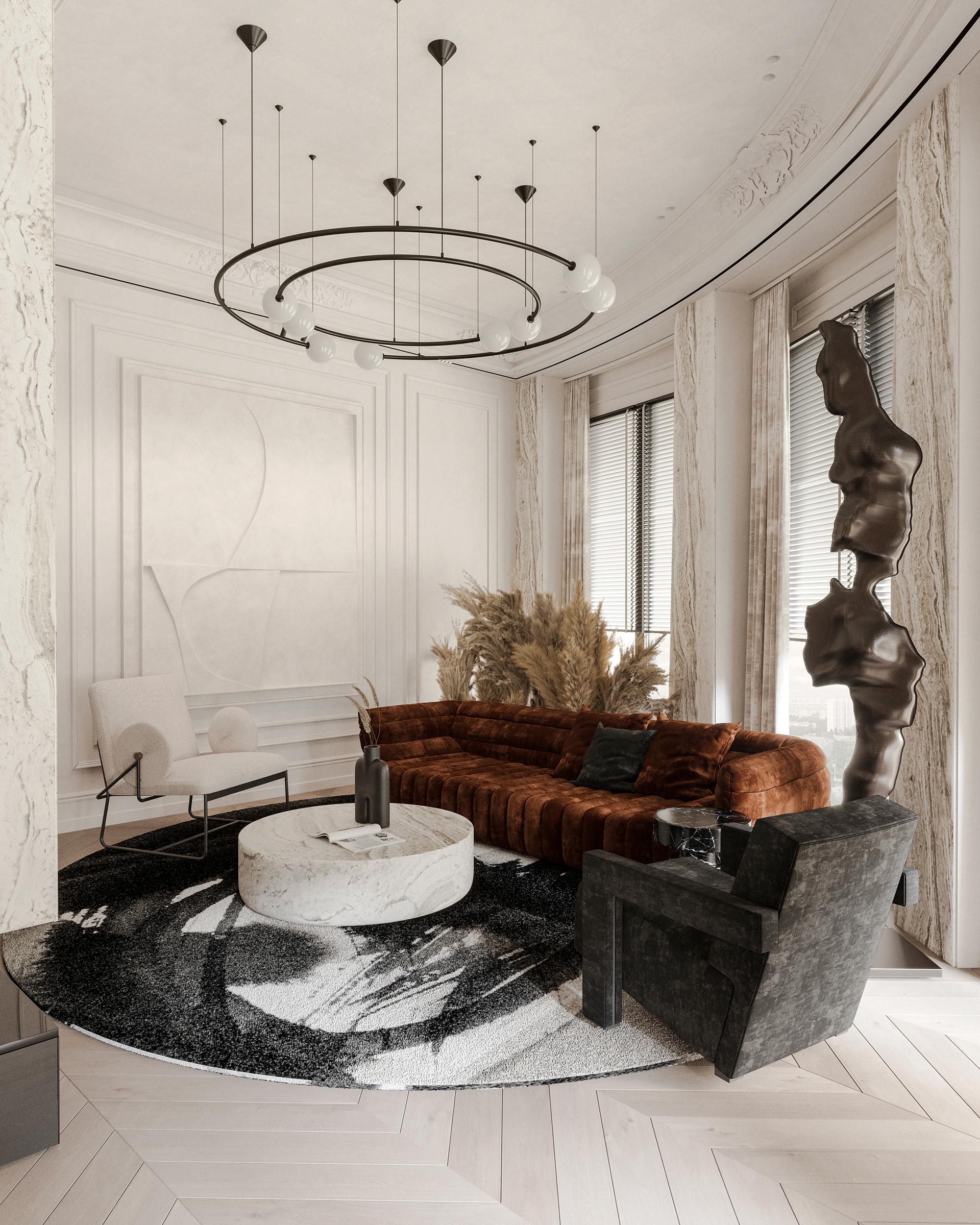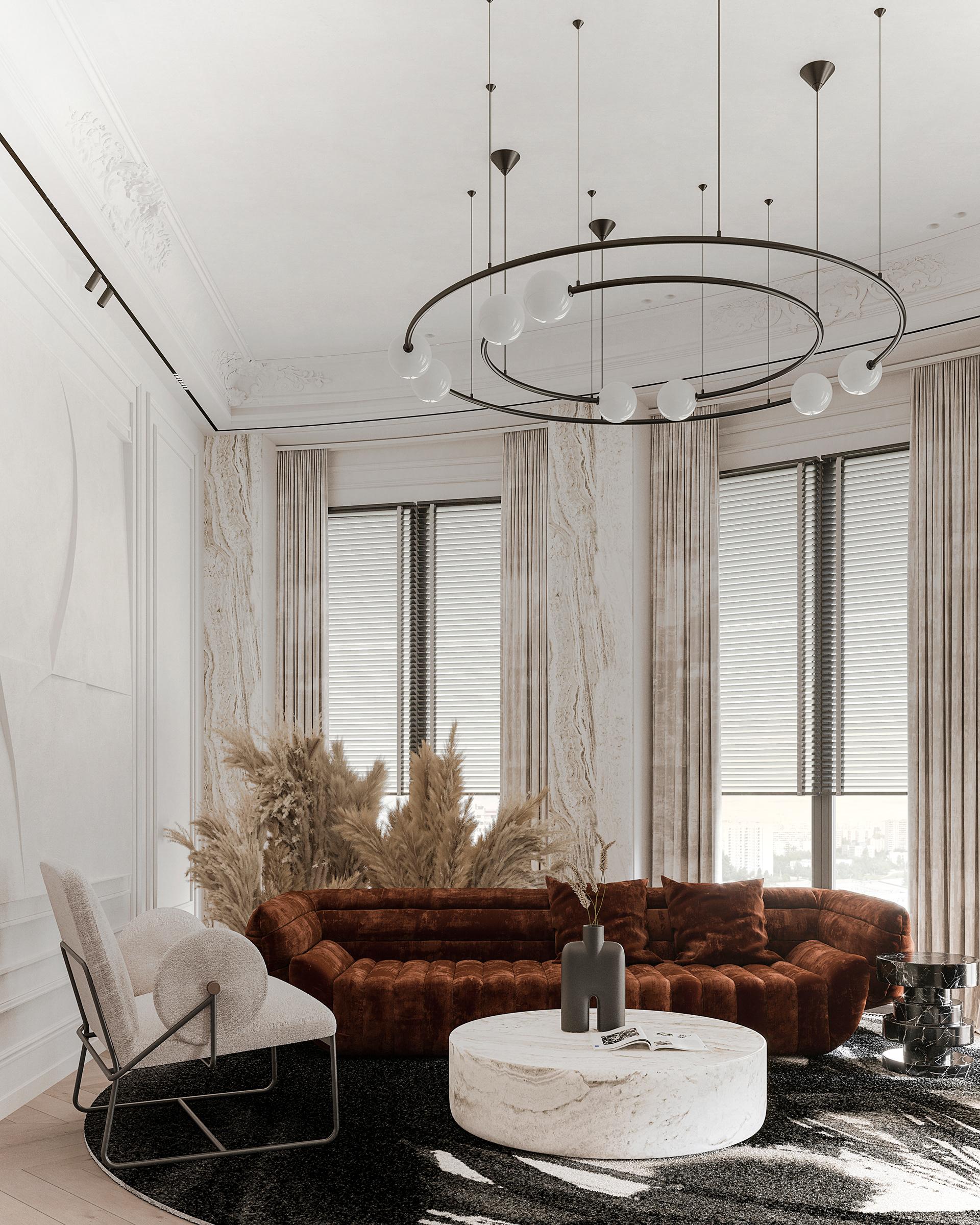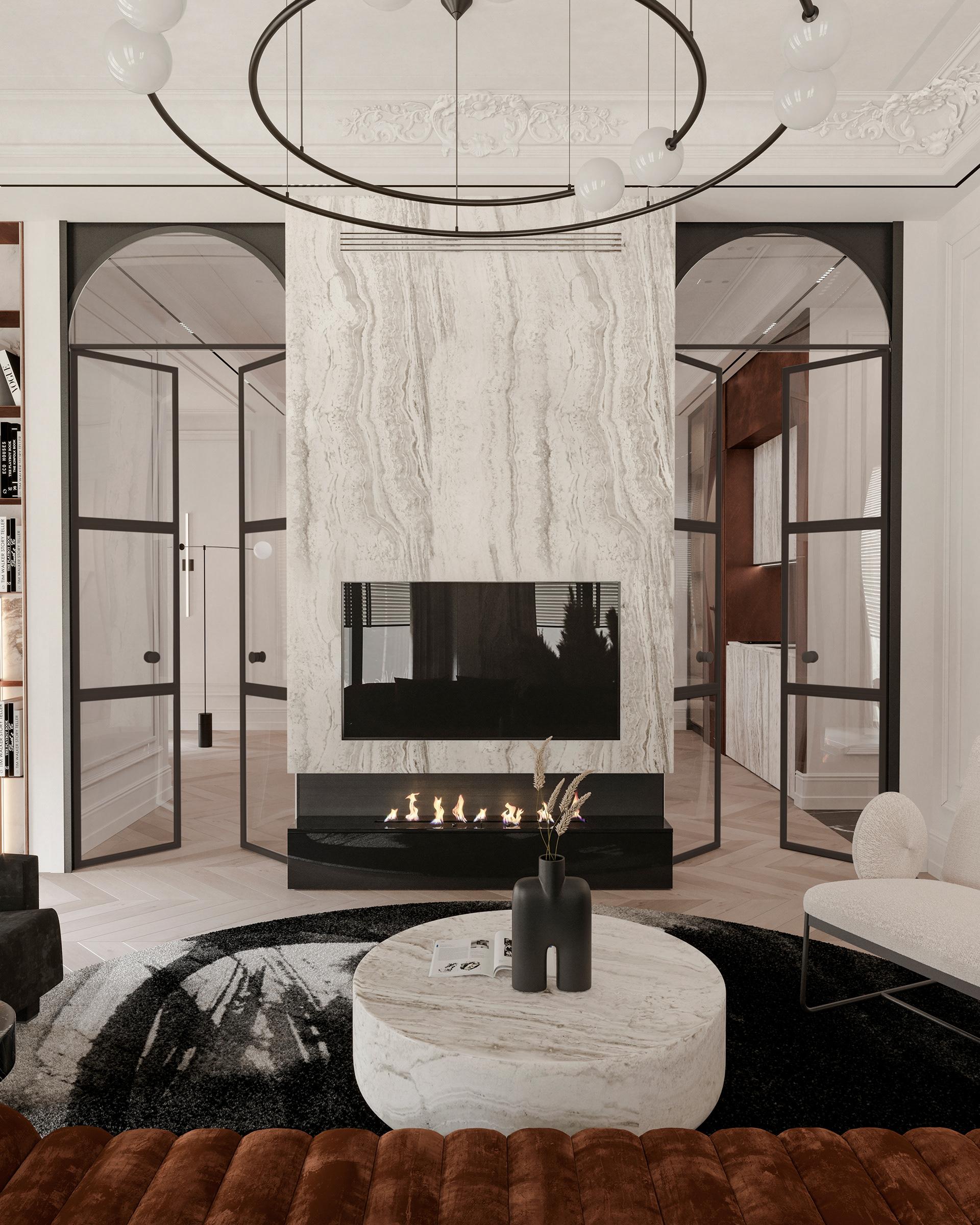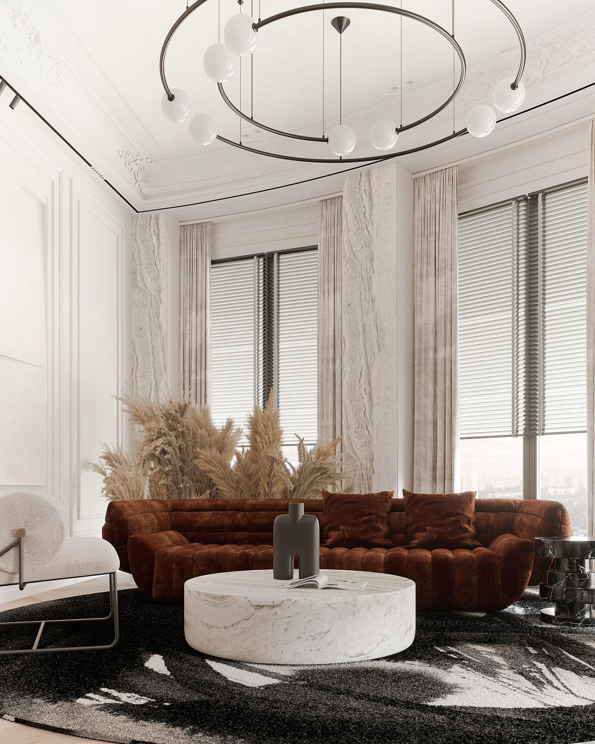 客廳:整體以白色為主色調(diào),營造出明亮、干凈的氛圍,搭配焦糖色的沙發(fā),為空間注入溫暖與活力,形成鮮明的色彩對比,既保留了法式風(fēng)格的優(yōu)雅,又增添了現(xiàn)代時尚感。圓形的大理石茶幾質(zhì)感十足,與沙發(fā)形成剛?cè)岵?jì)的搭配。沙發(fā)旁的淺色單人椅增加了座位的多樣性。天花板上精致的雕花裝飾是法式風(fēng)格的經(jīng)典元素,搭配獨特的環(huán)形吊燈,既具有復(fù)古韻味又不失現(xiàn)代設(shè)計感。窗簾采用與整體協(xié)調(diào)的淺色系,材質(zhì)柔軟,進(jìn)一步烘托出浪漫的氛圍。大理石材質(zhì)的壁爐成為客廳的視覺焦點,黑色邊框與內(nèi)嵌的火焰裝置相結(jié)合,既展現(xiàn)了法式傳統(tǒng)壁爐的優(yōu)雅造型,又融入了現(xiàn)代的實用功能,為空間增添了溫馨與奢華感。