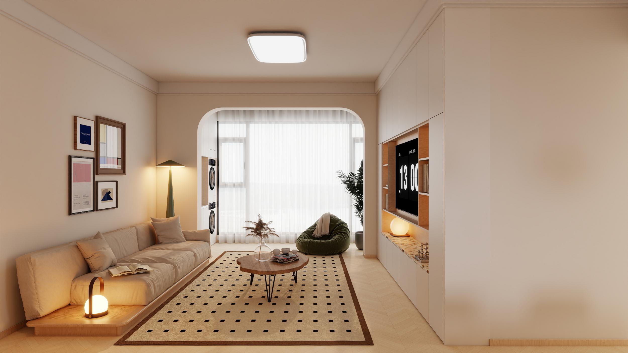 以淺色為主,搭配木質(zhì)地板,營造出明亮溫馨的氛圍。電視背景墻采用整體柜設(shè)計(jì),兼具收納與展示功能,中間開放格內(nèi)置燈帶,增加空間層次感與氛圍感。不規(guī)則形狀的木質(zhì)茶幾搭配帶有幾何圖案的地毯,增添自然與靈動(dòng)之感。綠植和豆袋椅的加入,為空間帶來生機(jī)與休閑氣息。