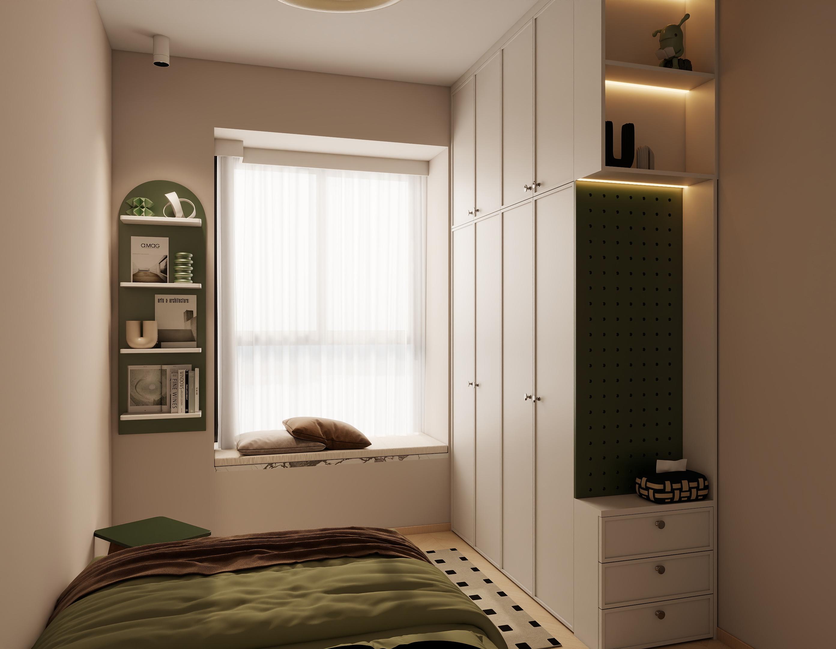 次臥(榻榻米房間):以白色和淺木色為主,打造出簡潔清新的空間。定制榻榻米床與衣柜一體,最大化利用空間,滿足收納與睡眠需求。書桌和椅子的配置,使房間兼具書房功能。飄窗處的擱架可擺放書籍和裝飾品,增加空間利用率。