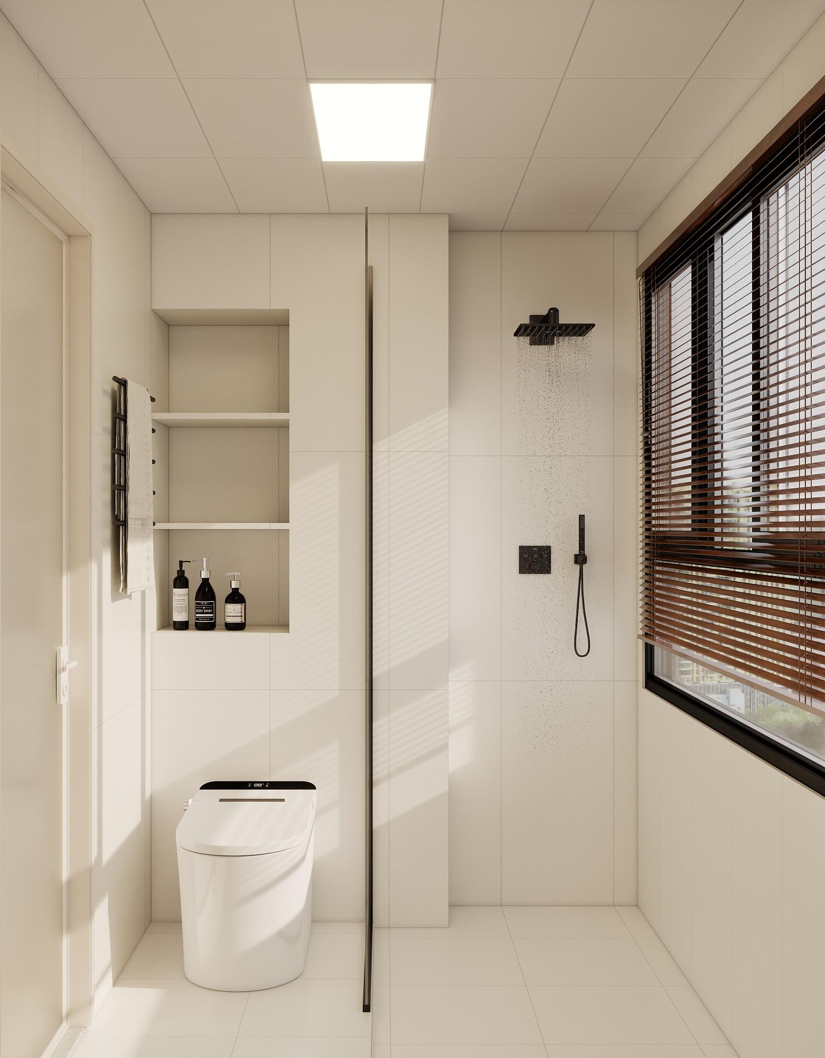 衛(wèi)生間采用干濕分離設(shè)計(jì),提高使用效率。智能馬桶、壁龕收納和淋浴噴頭等設(shè)施齊全,滿足日常使用需求。淺色瓷磚鋪貼,使空間顯得干凈整潔,窗戶搭配百葉簾,保證通風(fēng)與隱私。