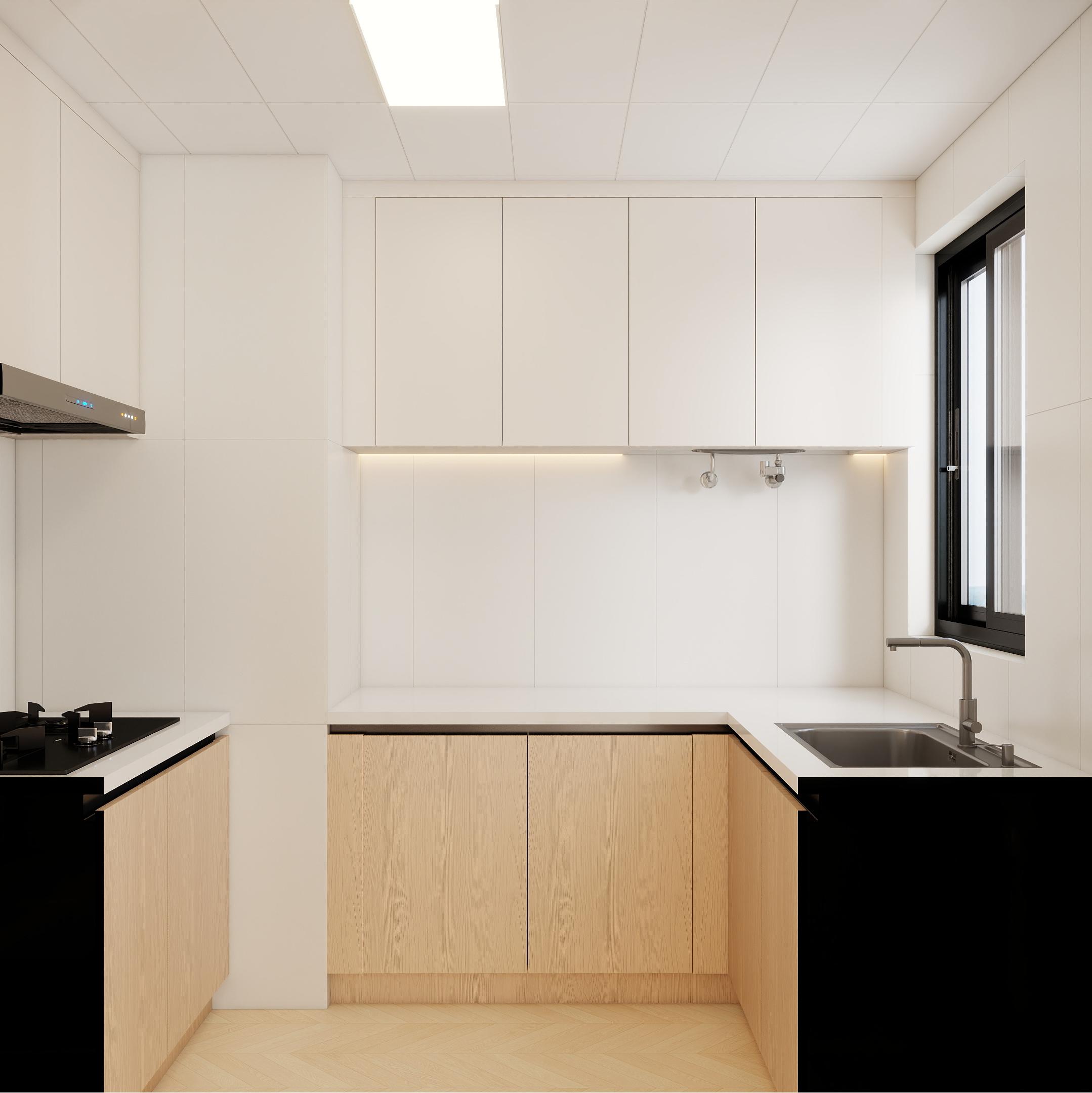 廚房呈“L”形布局,操作流程合理。白色櫥柜搭配淺色臺(tái)面,簡潔明亮。墻面安裝抽油煙機(jī),下方設(shè)置灶臺(tái),水槽位于窗邊,利于通風(fēng)和采光。整體設(shè)計(jì)注重實(shí)用性與收納功能,方便烹飪操作。