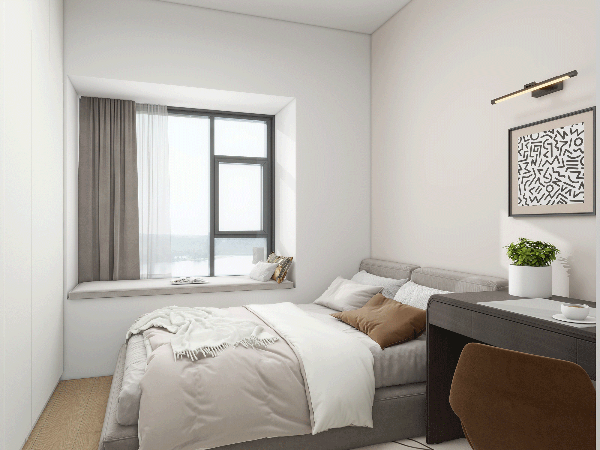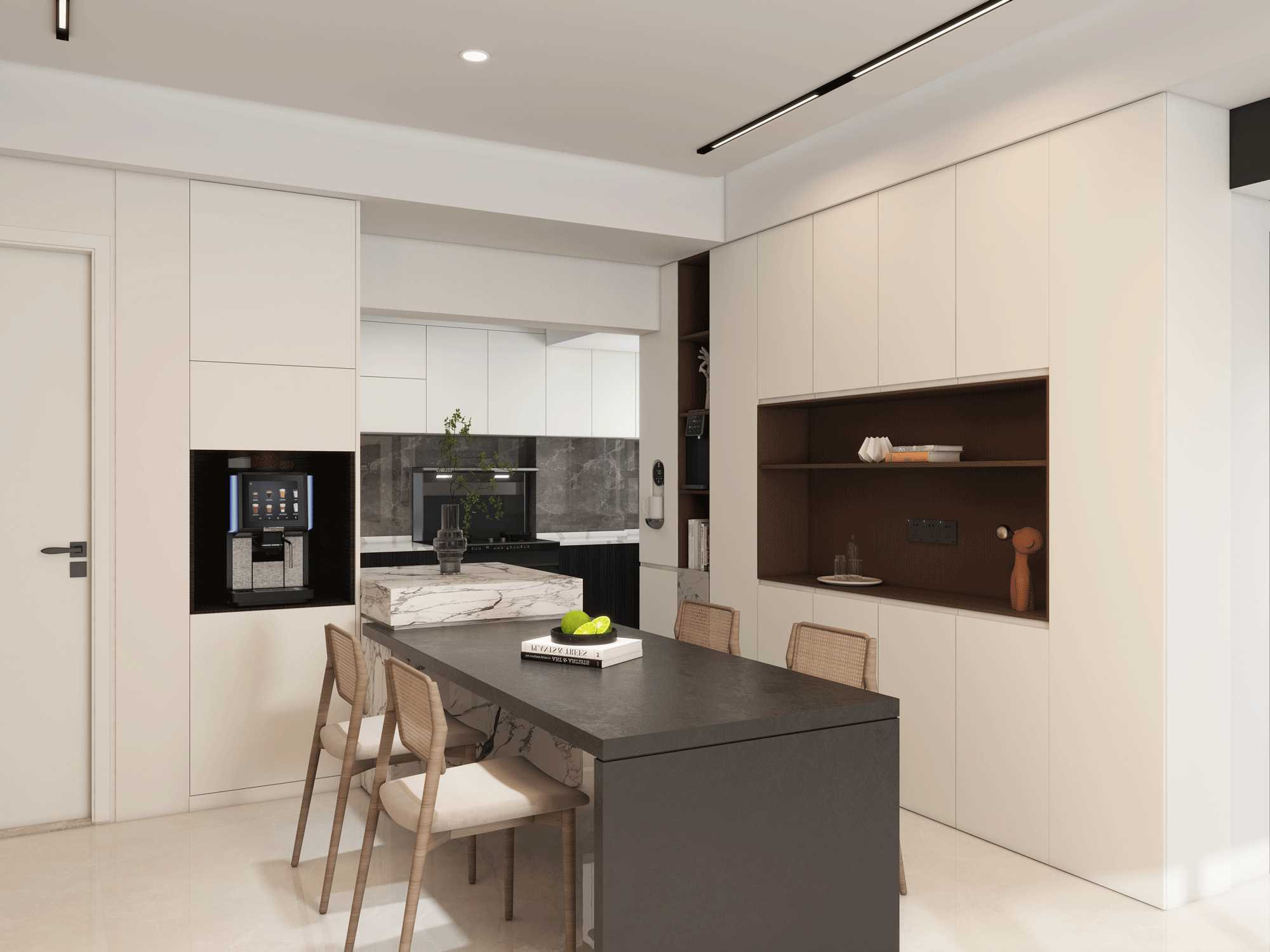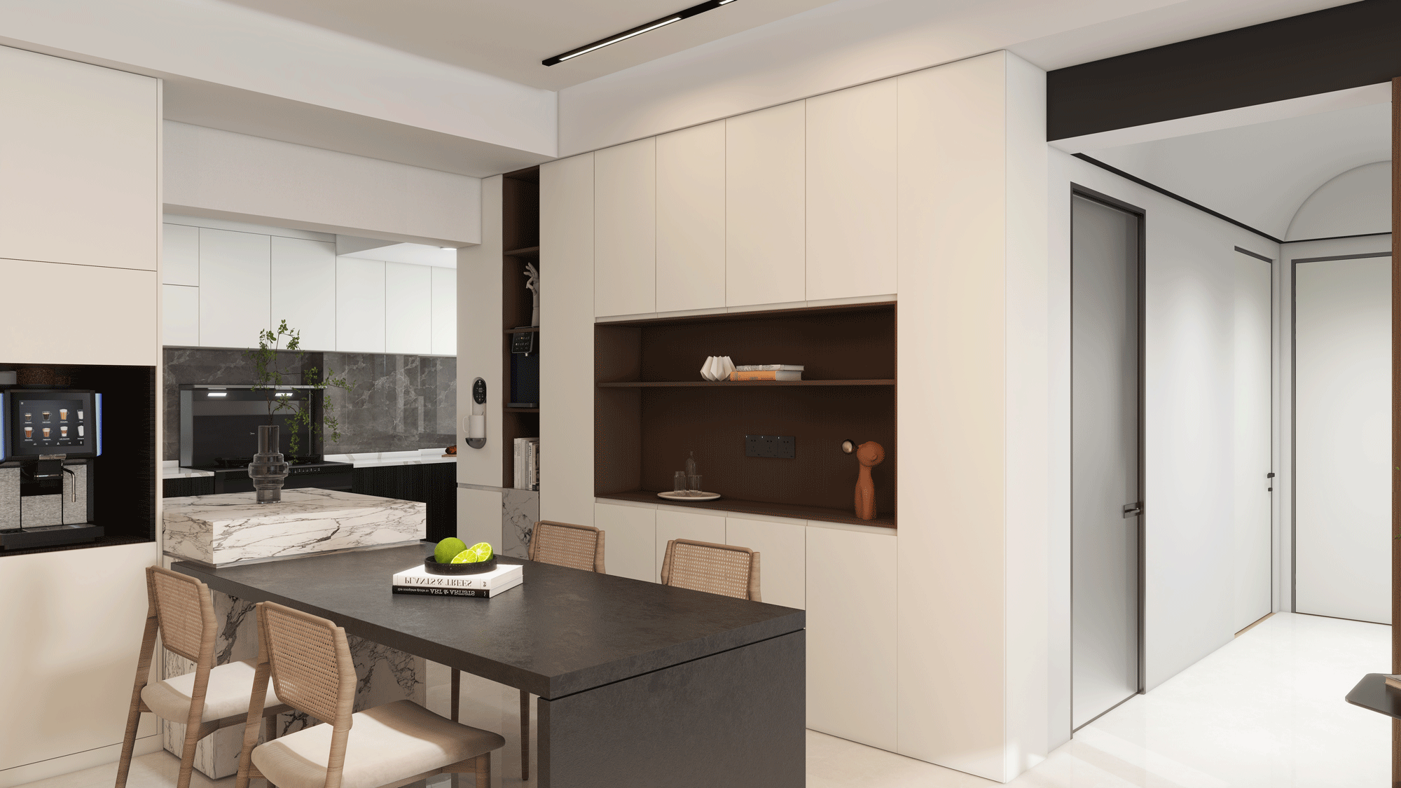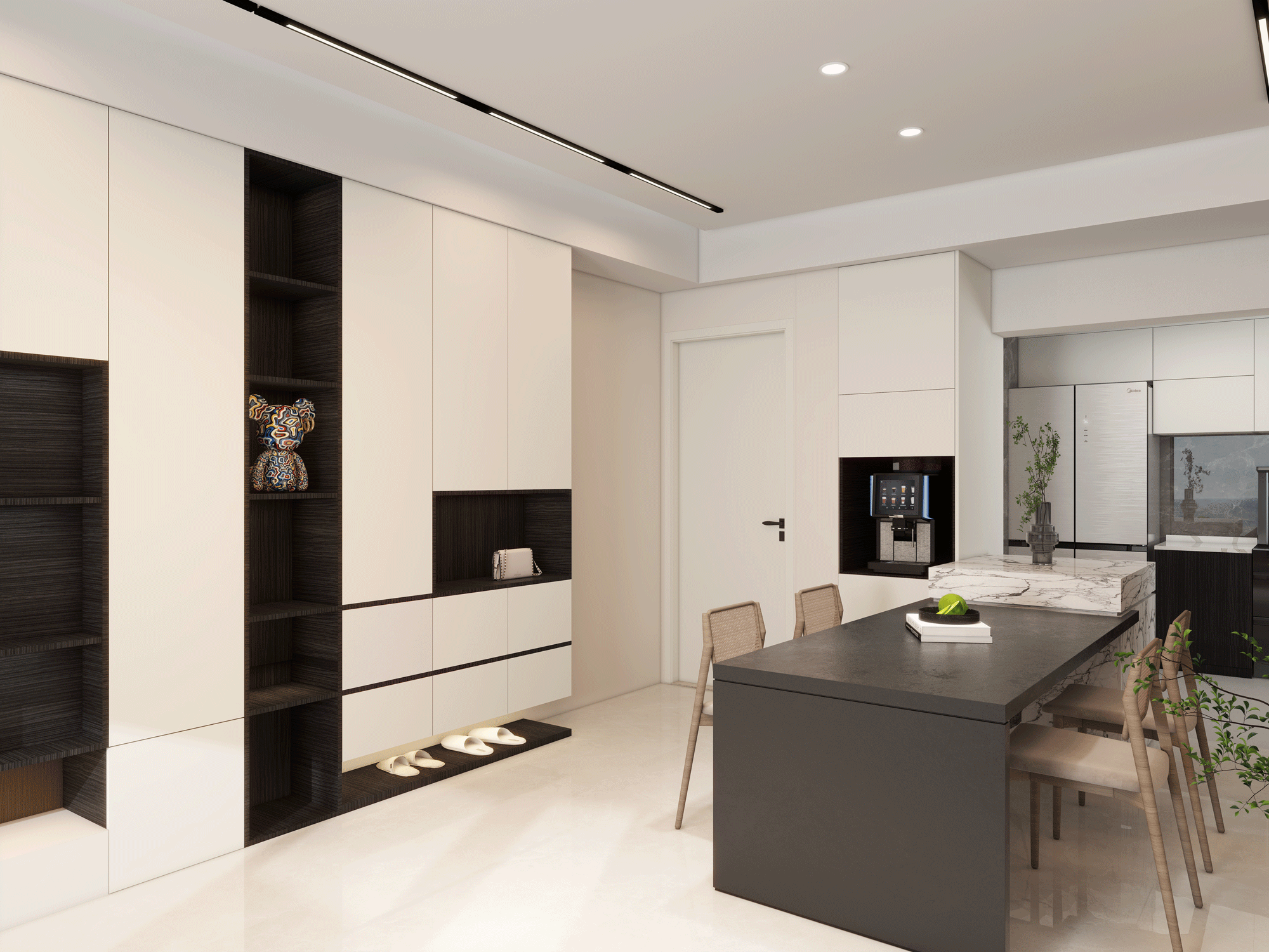 這是現(xiàn)代簡約風(fēng)格,核心在于“簡約”,即去除多余的裝飾,追求形式與功能的完美結(jié)合。無論是墻面、地面、頂棚,還是家具、燈具等,都以簡潔的造型、純潔的質(zhì)地和精細的工藝為特征。強調(diào)少即是多的設(shè)計理念,通過少量的元素和裝飾,營造出寬敞、明亮、通透的空間感。