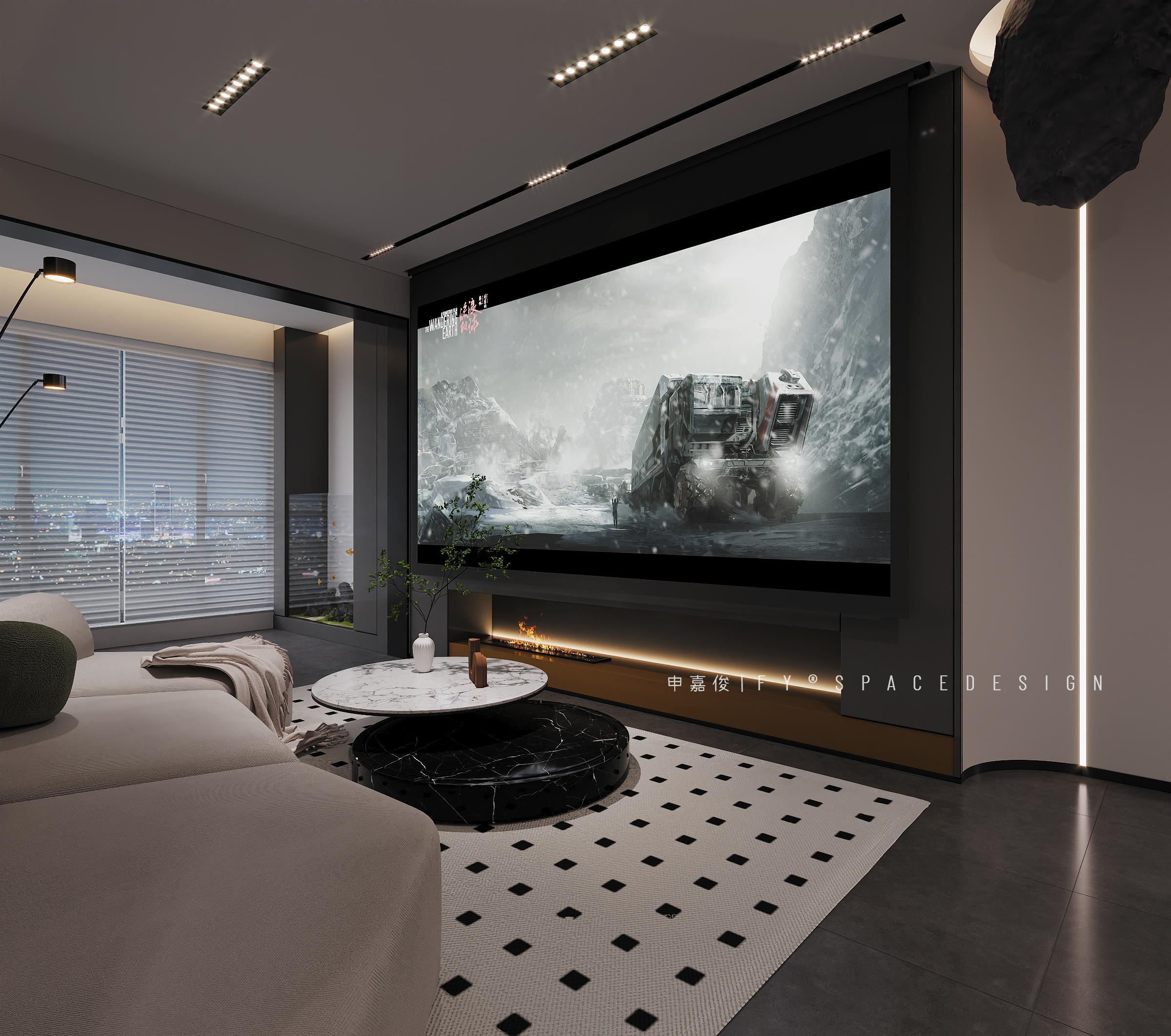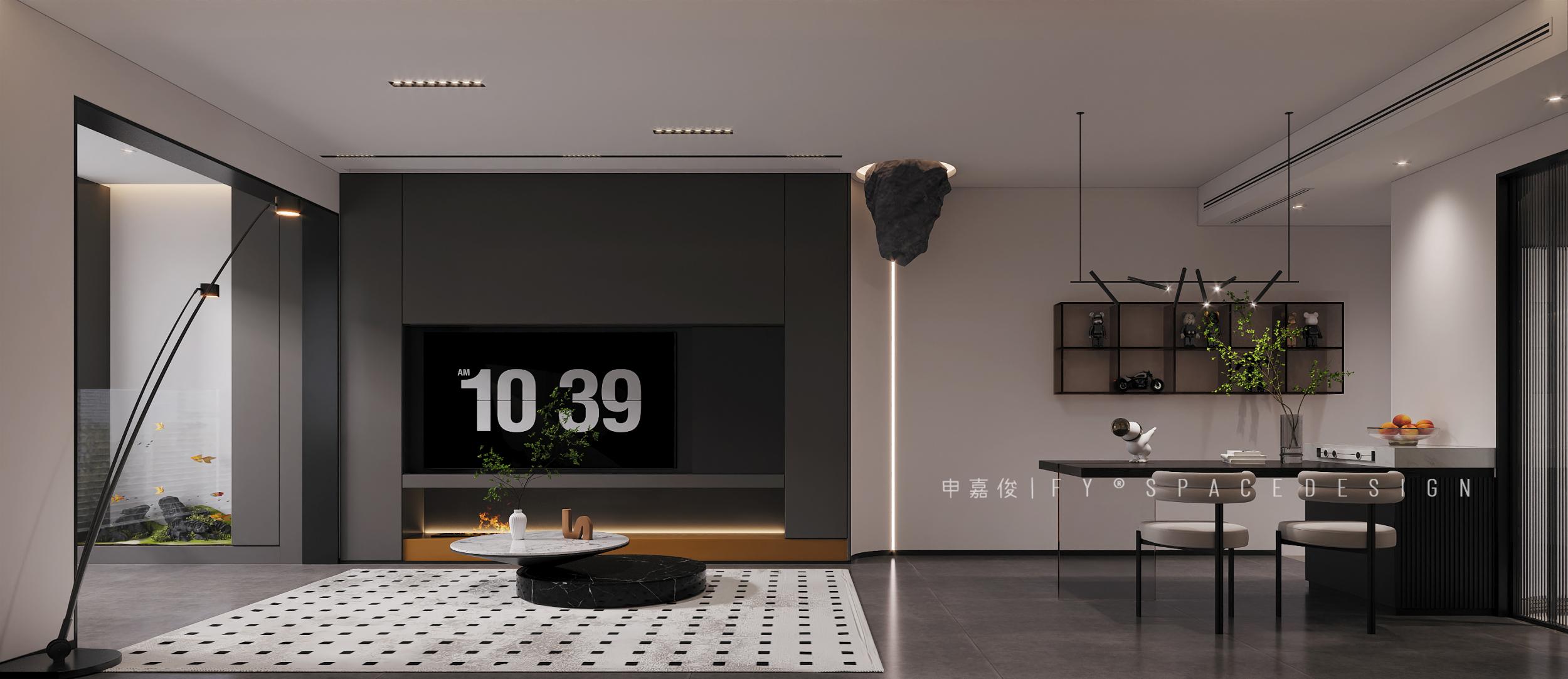 客廳采用了簡潔的線條和中性色調(diào),營造出寬敞、明亮且現(xiàn)代的氛圍。墻面裝飾有獨(dú)特的立體紋理,增加了空間的層次感和視覺焦點(diǎn)。白色的模塊沙發(fā)搭配黑白格子地毯,顯得簡潔而富有設(shè)計(jì)感。大理石與黑色結(jié)合的圓形茶幾,增添了一份優(yōu)雅與精致。無主燈設(shè)計(jì),采用嵌入式筒燈和線性燈帶,提供了均勻而柔和的照明。落地?zé)魟t為局部區(qū)域提供了重點(diǎn)照明,增加了空間的溫馨感。