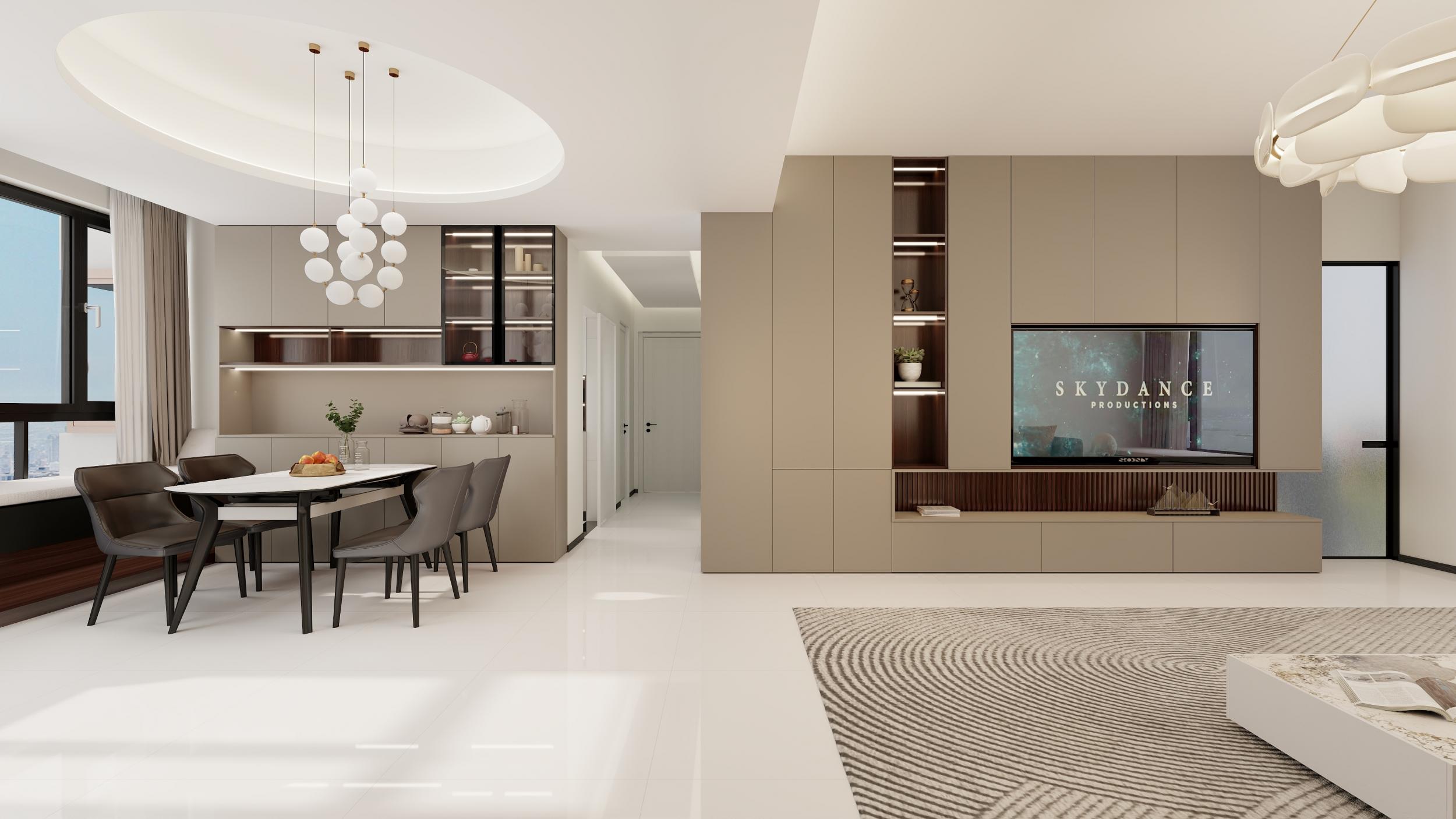 餐廳區(qū)域的圓形天花板,與客廳空間錯落有致,不僅增添了空間的立體感,還巧妙地引導了入戶的視覺焦點。