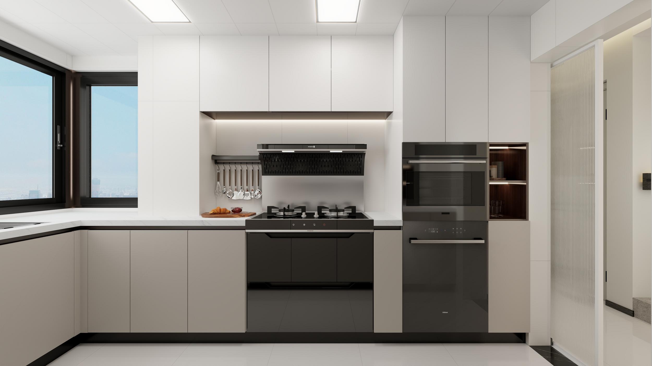 廚房區(qū)域大面積的窗戶讓自然光線充分灑入廚房,營造出一種明亮而通透的視覺效果。廚房的布局經(jīng)過精心規(guī)劃,確保了空間的充分利用和操作的便捷性。