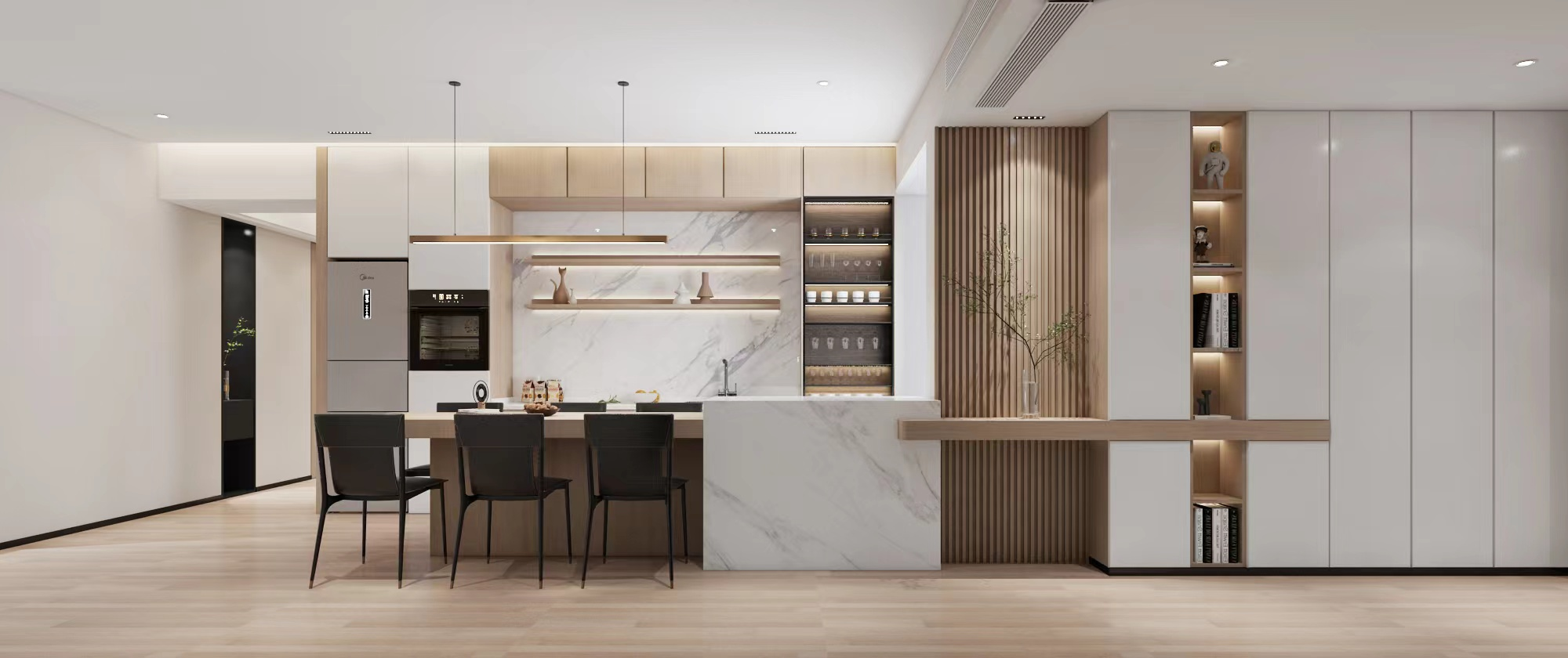 ?? 餐廳 Restaurant | 開放式西廚餐臺(tái)與玄關(guān)背景相連接,相得益彰/平衡,門口的綠植搭配原生態(tài)的木色,