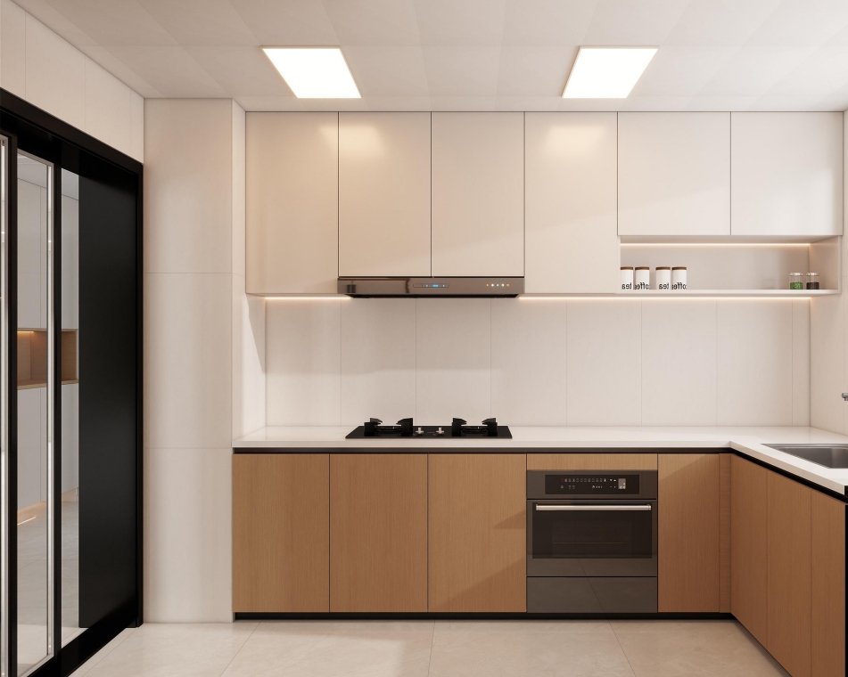 現(xiàn)代簡(jiǎn)約風(fēng)格的廚房設(shè)計(jì)注重實(shí)用性和美觀性的結(jié)合。柔和的吸頂燈,以及局部照明櫥柜下燈帶等,滿足烹飪和清洗等需求。