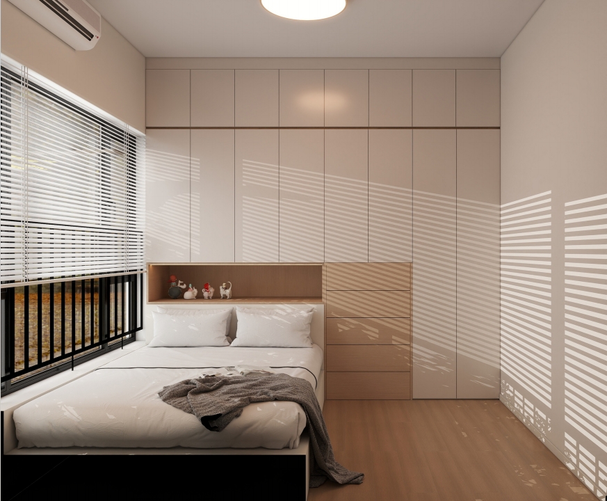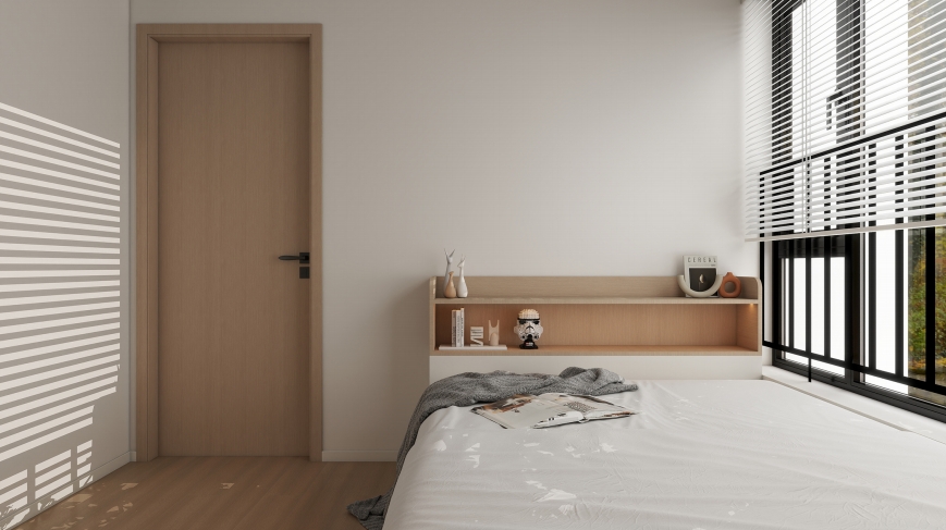 主臥的設(shè)計(jì)注重舒適和私密性。衣柜和床頭柜等家具也采用簡(jiǎn)約造型,注重實(shí)用性和美觀性的結(jié)合。床品選擇高品質(zhì)純色床單、簡(jiǎn)約風(fēng)格的枕頭和被子。