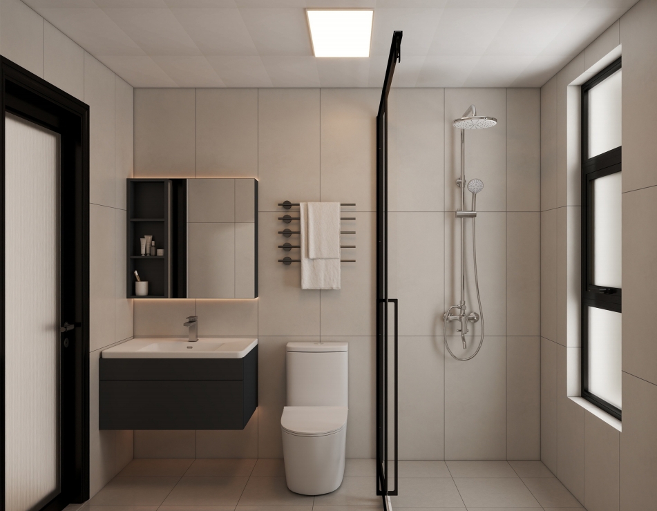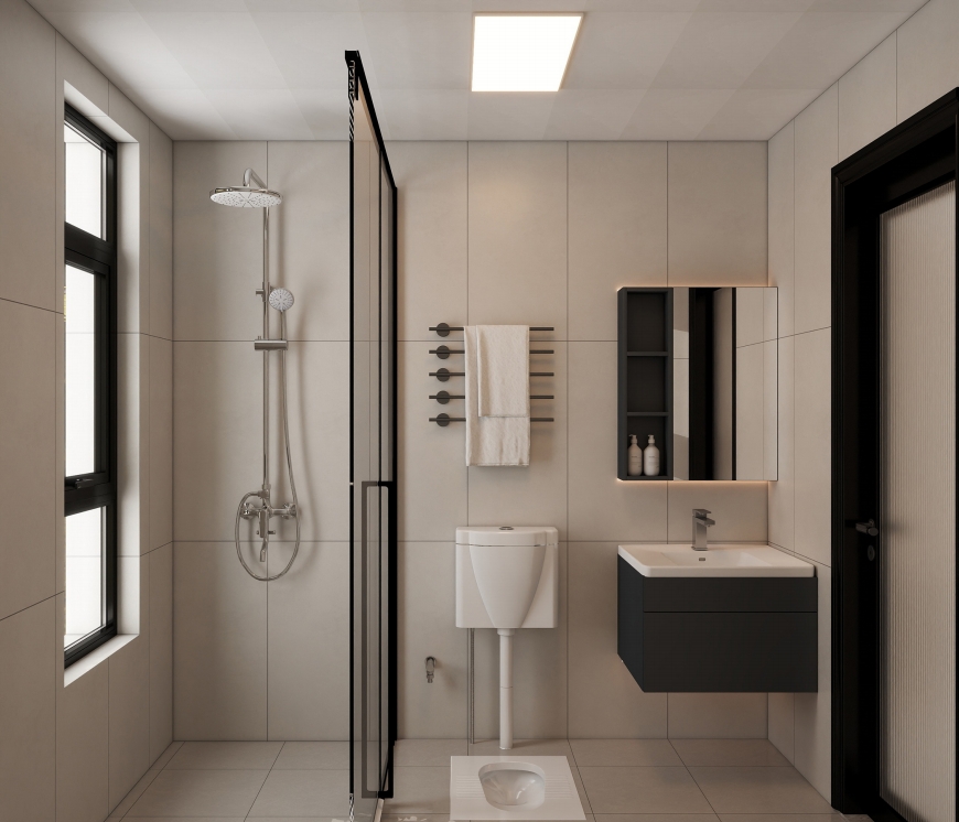衛(wèi)生間墻面和地面采用防滑、易清潔的瓷磚,以白色為主,打造出明亮、整潔的氛圍。