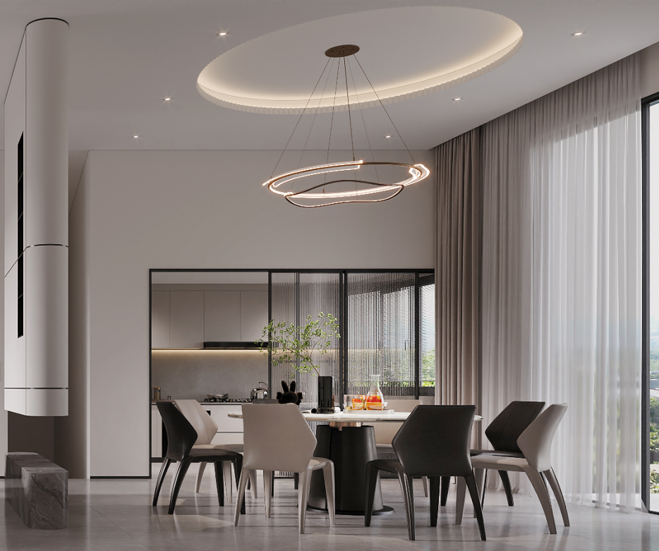 餐廳:與廚房相連,采用極窄邊聯(lián)動門作為間隔,這種設(shè)計既保證了空間的獨立性,又在視覺上實現(xiàn)了通透感。黑白相間的餐桌椅,簡約而經(jīng)典,與整體風(fēng)格完美契合。抬頭仰望,別出心裁的吊頂造型搭配簡約且極具設(shè)計感的吊燈,瞬間提升了空間的時尚感與高級感,在滿足用餐功能的同時,也為用餐者帶來視覺與心靈的雙重享受。