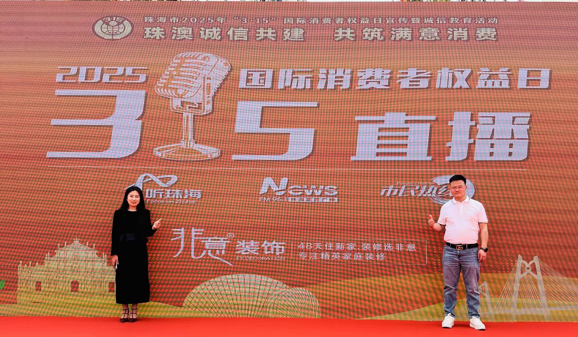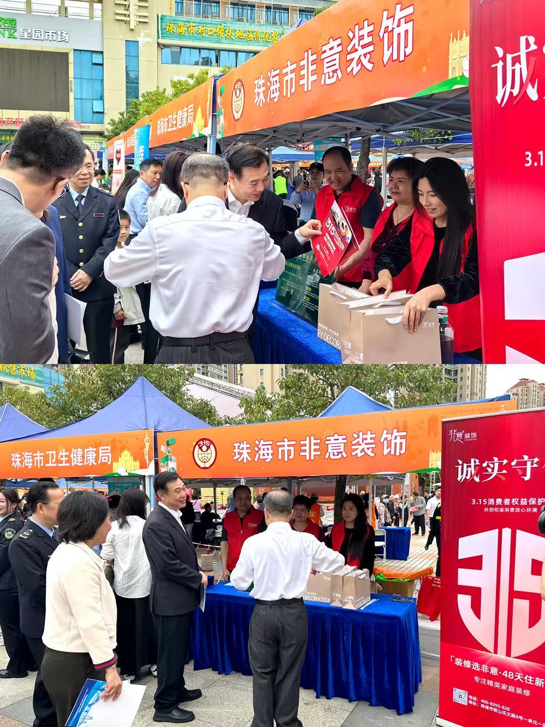 珠海市2025年“3.15”國際消費者權(quán)益日活動現(xiàn)場,非意裝飾總經(jīng)理賀巧作為誠信示范企業(yè)代表與廣東省珠海市政府副市長黃振球,珠海市市場監(jiān)督管理局副局長趙文樂、鄭國慶,珠海市消費者協(xié)會主任李志等領(lǐng)導(dǎo)展開深度互動。