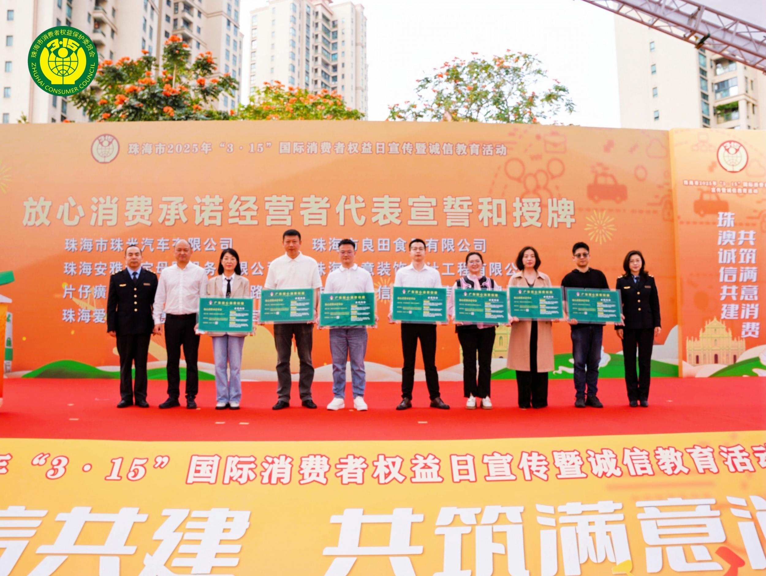 珠海市3·15國際消費者權(quán)益日主題活動現(xiàn)場,非意裝飾創(chuàng)始人賀巧代表承諾單位宣誓,珠海市市場監(jiān)督管理局副局長鄭國慶頒授“廣東放心消費承諾單位”榮譽獎牌。